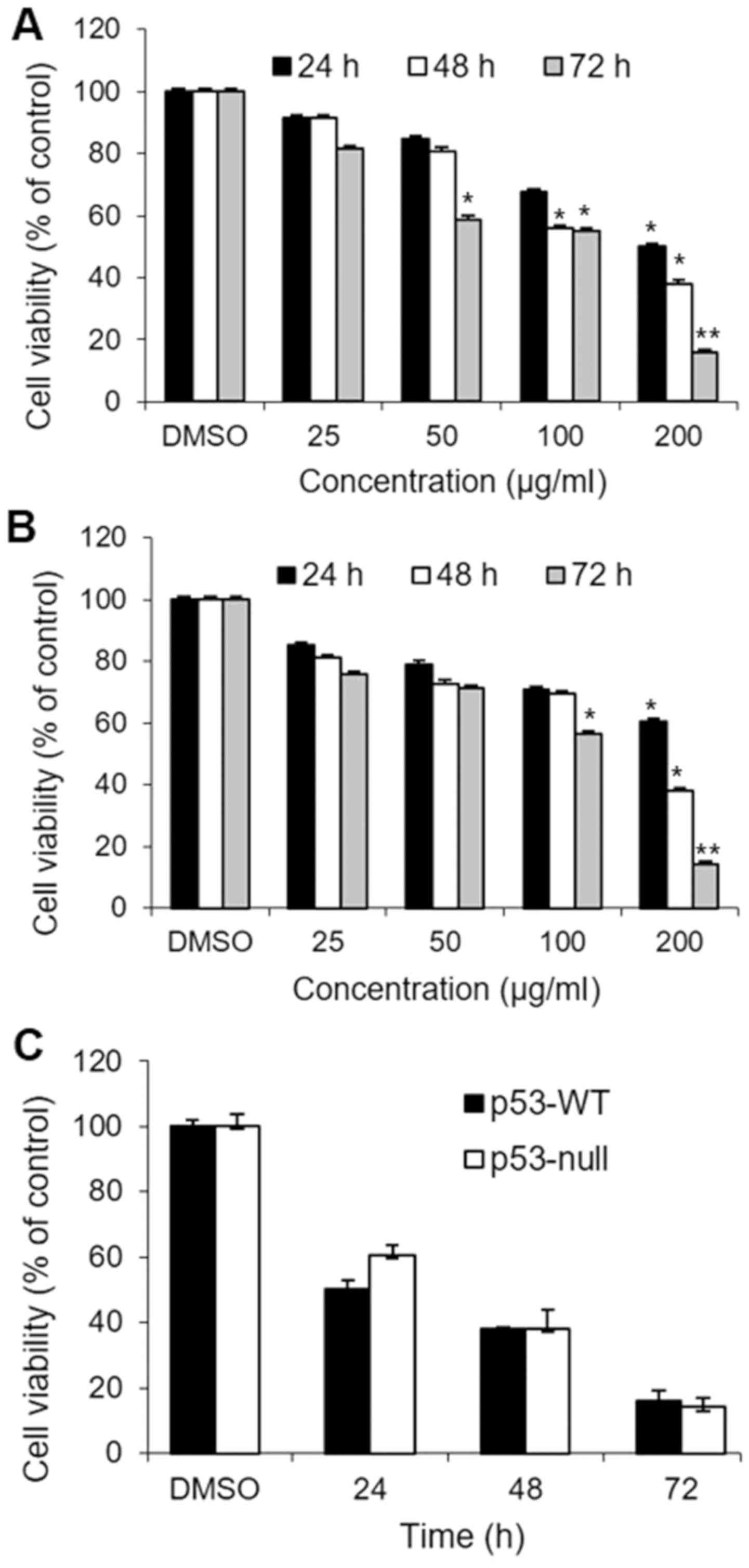 We first evaluated the cytotoxic effects of S. quelpaertensis Nakai extracts in HCT 116 human colon carcinoma cells. Both p53-WT and p53-null cells were treated with 0, 25, 50, 100 and 200 µg/ml of S. quelpaertensis Nakai for 24, 48 and 72 h responded similarly, with respect to viability, in that both treatments decreased the percentage of viable cells dose- and time-dependently (Fig. 1A and B). The DMSO vehicle did not affect cell viability relative to colon cancer cells cultured in medium alone. Maximum curcumin-induced cytotoxicity was evident after 72 h exposure to 200 µg/ml of S. quelpaertensis Nakai extracts (P<0.01). Exposure to 200 µg/ml S. quelpaertensis Nakai for 72 h, reduced viability in p53-WT and p53-null cells to 16 and 14%, respectively, whereas comparable values after treatment with 200 µg/ml S. quelpaertensis Nakai extracts for 24 h, were 50 and 60% (Fig. 1A and B). Fig. 1C shows that there was no significant difference between S. quelpaertensis Nakai extracts-treated p53-WT and p53-null cells with respect to cell viability at 200 µg/ml, implying that p53 activation was not required for S. quelpaertensis Nakai extracts-induced cytotoxicity.