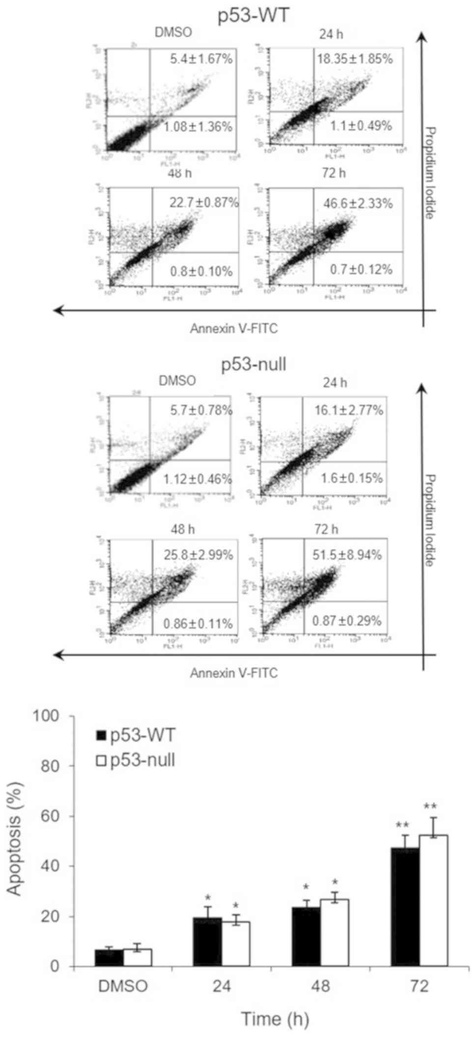 Fig. 2 shows that 200 µg/ml of S. quelpaertensis Nakai extracts-induced apoptosis in each of the cell types. Approximately 19.5 and 23.5% of p53-WT cells were apoptotic after S. quelpaertensis Nakai extracts treatment for 24 and 48 h, respectively (8.6- and 10.4-fold, respectively, over control level) (Fig. 2). These apoptotic cell deaths by S. quelpaertensis Nakai extracts were observed to be approximately the same in p53-null cells as well (Fig. 2). Treatment with 200 µg/ml of S. quelpaertensis Nakai extracts for 24 and 48 h resulted in 17.7 and 26.6% of apoptosis, respectively (6.8- and 10.2-fold increases, P<0.05 and P<0.01; Fig. 2). A stronger apoptotic response was induced by S. quelpaertensis Nakai extracts treatment for 72 h, inducing maximum frequencies of 47.3 and 52.4% in both cell lines (20.8- and 20.1-fold elevation over controls, P<0.01; Fig. 2).