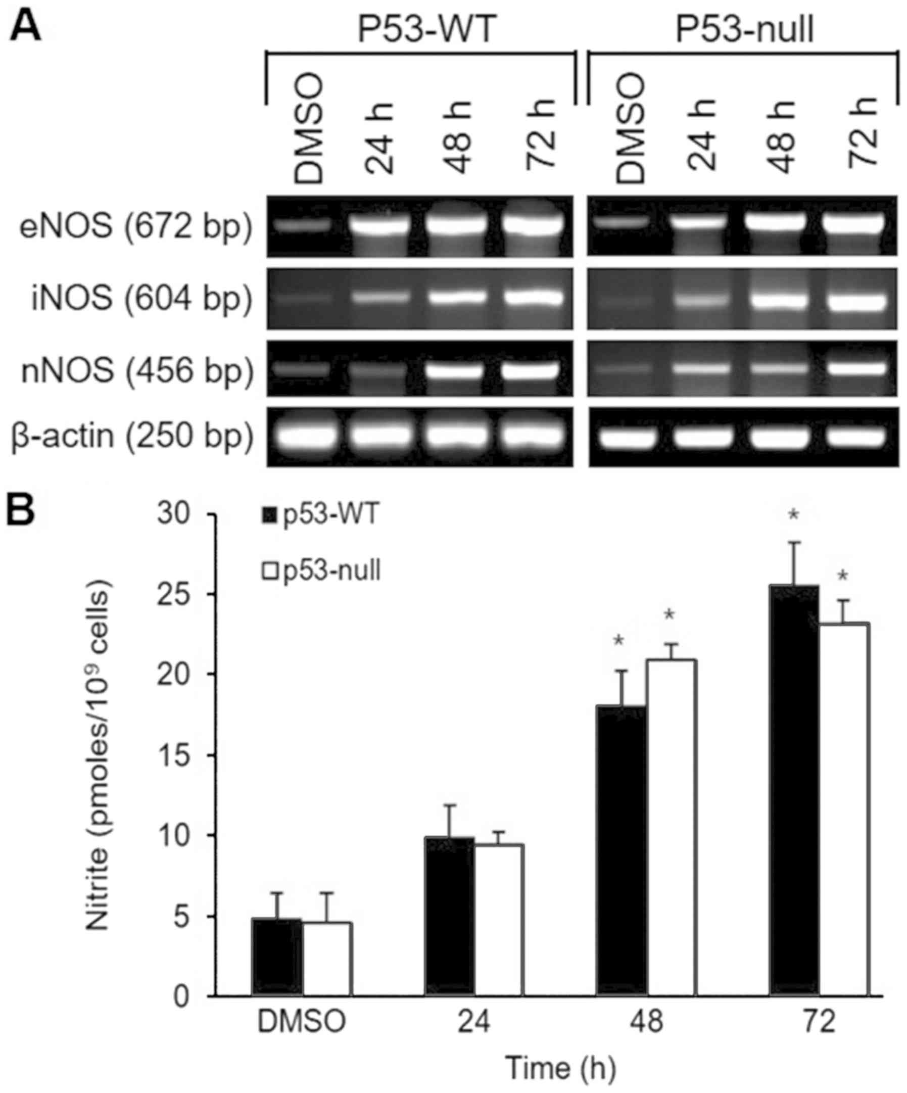 The effect of S. quelpaertensis Nakai on three isoforms of NOS (eNOS, iNOS and nNOS) mRNA expression was evaluated by use of semiquantitative RT-PCR (Fig. 3A). RT-PCR analysis showed that after 48 and 72 h treatment with 200 µg/ml of S. quelpaertensis Nakai induced increases in each NOS isoform in p53-WT and p53-null cells, with apparently equal potency (Fig. 3A). Expression of the β-actin gene and production of its mRNA was not altered during any of the treatments (Fig. 3A). These findings are consistent with the time-dependent increases in nitrite production were observed in both cell type in response to S. quelpaertensis Nakai extracts treatments (Fig. 3B).