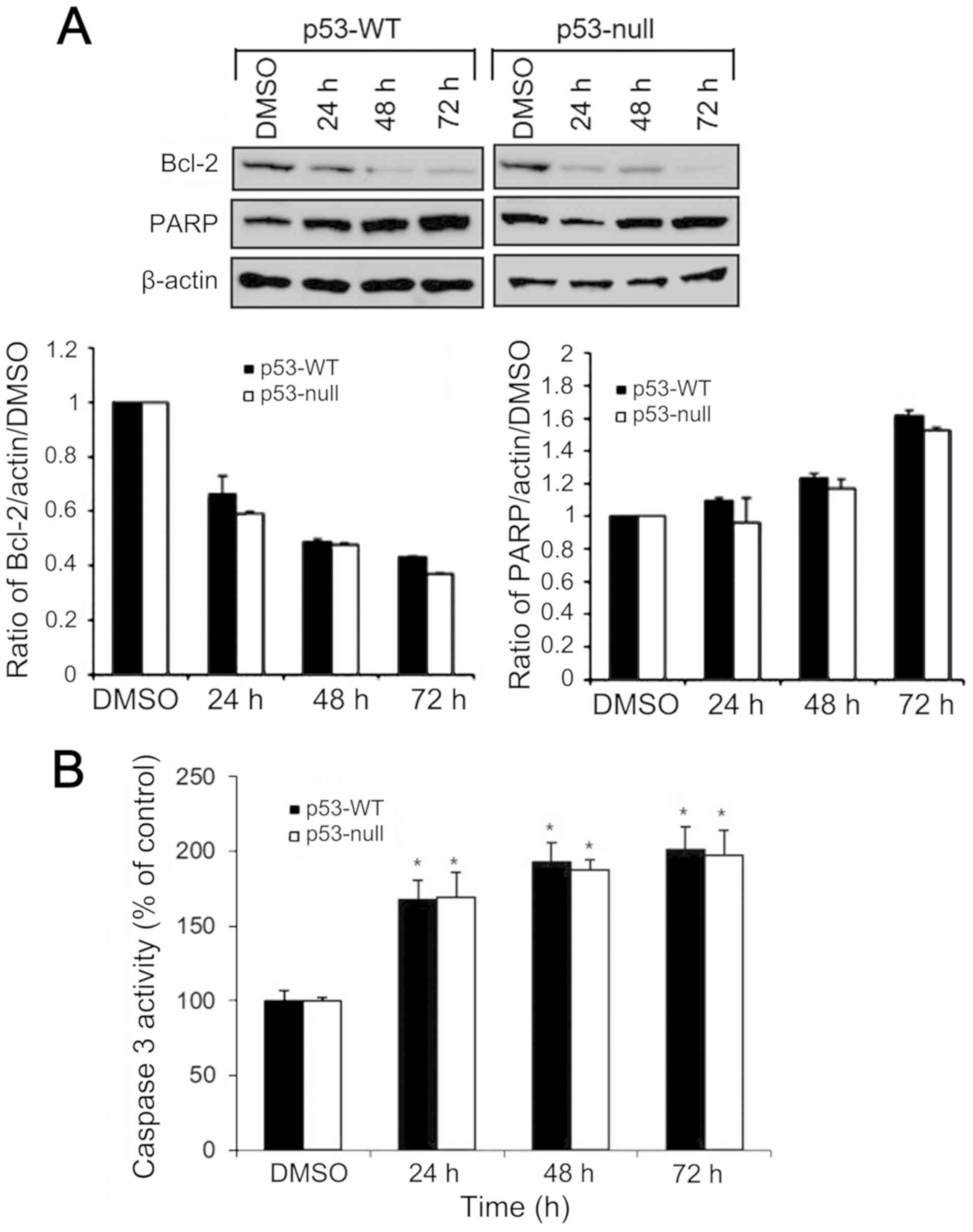 The levels of Bcl-2 and PARP protein expression in HCT116 cells were analyzed by western blotting. The p53-WT and p53-null cells were treated with 200 µg/ml of S. quelpaertensis Nakai extracts for 24, 48 and 72 h. Compared with the control group, treatment with S. quelpaertensis Nakai downregulated the expression of Bcl-2, whereas the levels of PARP were upregulated in both cells (Fig. 5A). To further determine the apoptotic cell death induced by S. quelpaertensis Nakai, HCT116 cells were left untreated or treated with 200 µg/ml of S. quelpaertensis Nakai extracts for 24, 48 and 72 h, and caspase-3 activity assay in a colorimetric assay based on the cleavage of the synthetic peptide Ac-DEVD-pNA was done (Fig. 5B). S. quelpaertensis Nakai increased caspase-3 activity by approximately 2-fold (Fig. 5B).