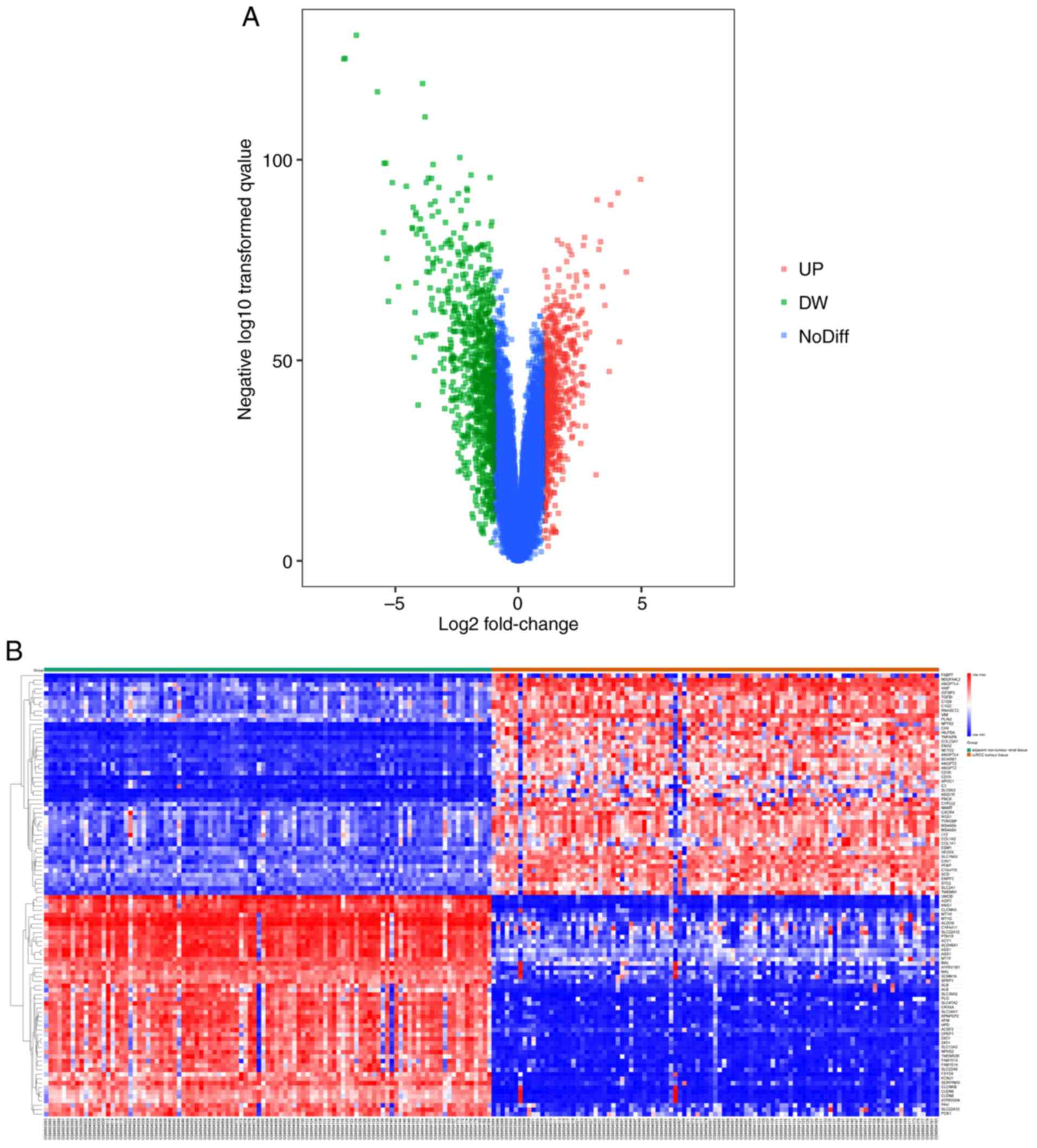 Data relevant to RCC was obtained from the GEO database and the GSE40435 (https://www.ncbi.nlm.nih.gov/geo/query/acc.cgi?acc=GSE40435) dataset was selected (9). This dataset was established on a GPL10558 platform. The GSE40435 dataset contains 101 pairs of ccRCC tumors and healthy adjacent tissue samples (age range, 42–84 years). In this database the basic information regarding each patient, including age, sex, tumor grade and type of tissue, is complete.