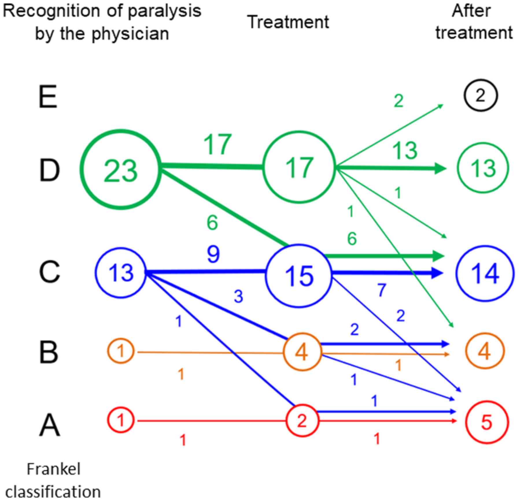 The orthopedists met with the patients following referral by physicians. They evaluated the severity of the neurological deficit (motor function) according to the Frankel classification (20). Furthermore, they determined whether the origin of the neurological deficit was the brain, the spinal cord or other peripheral nerves. They also evaluated the spinal instability in order to decide whether conservative treatment (with or without orthosis) or surgery was required (3).