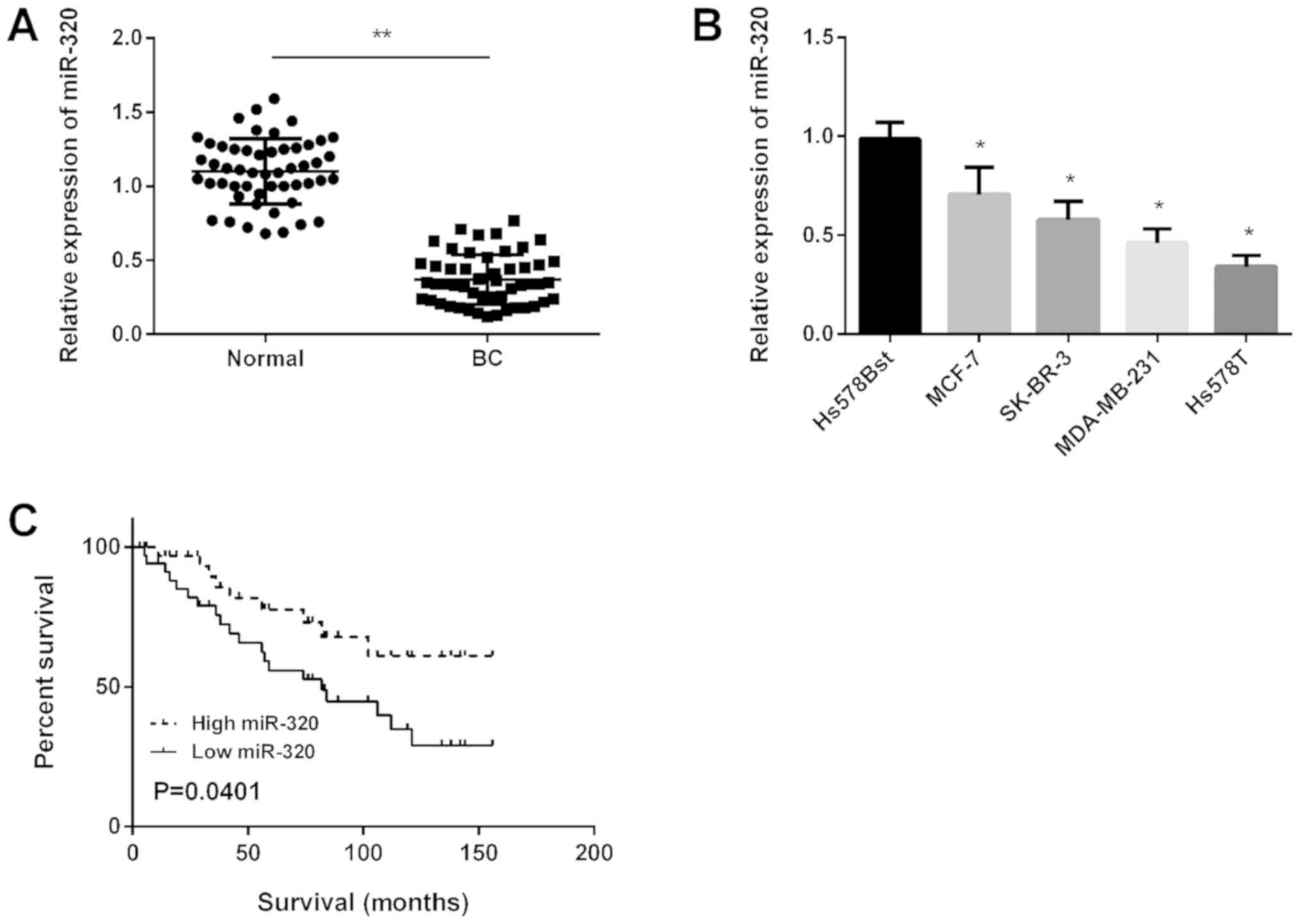 Luo L, Yang R, Zhao S, Chen Y, Hong S, Wang K, Wang T, Cheng J, Zhang T and Chen D: Decreased miR-320 expression is associated with breast cancer progression, cell migration, and invasiveness via targeting Aquaporin 1. Acta Biochim Biophys Sin (Shanghai). 50:473–480. 2018. View Article : Google Scholar : PubMed/NCBI