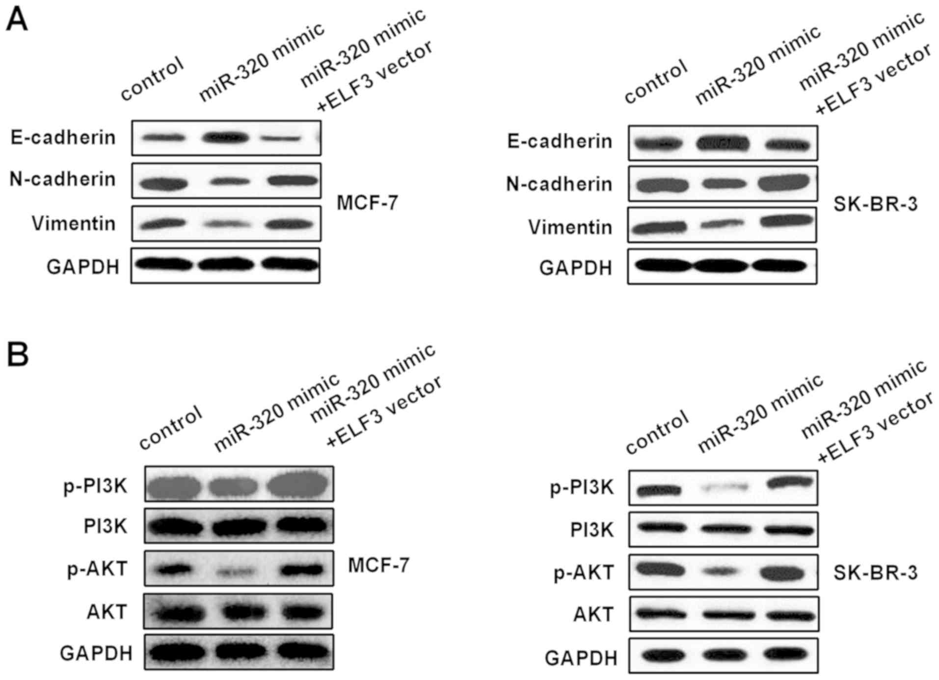 Zhang Z, Zhang J, Li J, Geng H, Zhou B, Zhang B and Chen H: miR‑320/ELF3 axis inhibits the progression of breast cancer via the PI3K/AKT pathway. Oncol Lett 19: 3239-3248, 2020.