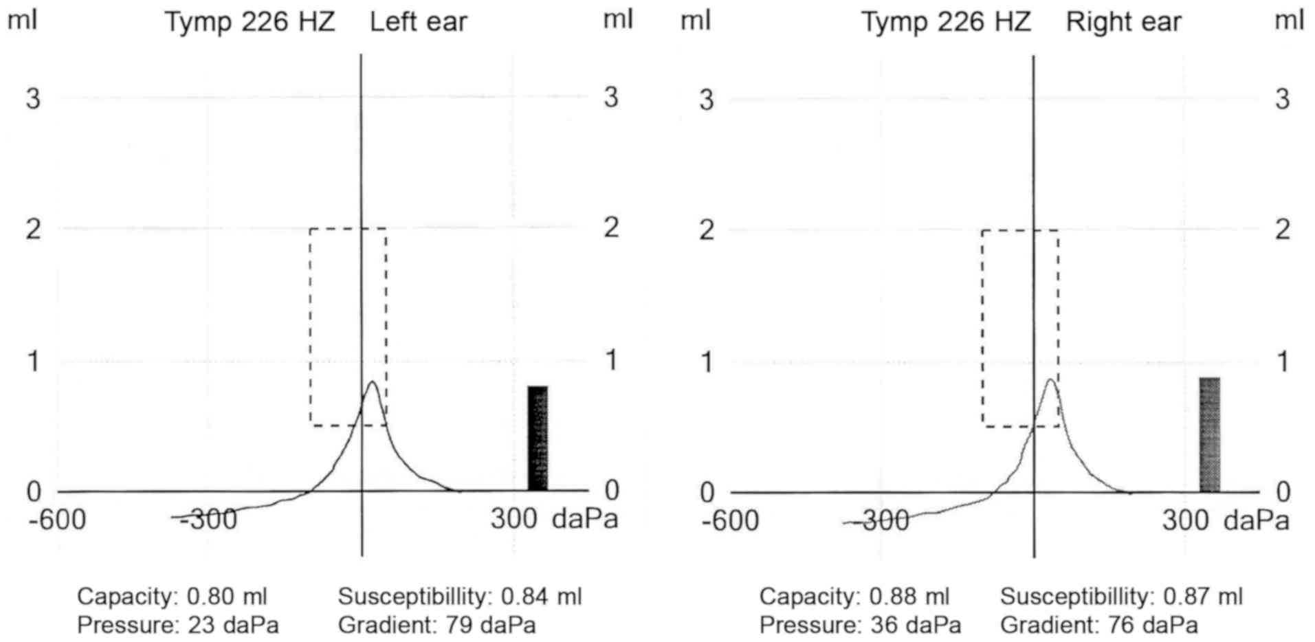 At the age of 8 years (Fig. 1) the girl came for consultation to the Clinic of Maxillofacial Orthopaedics and Orthodontics at the University of Medical Sciences in Poznań, of which she has been a patient ever since. To improve the aesthetics and function of the masticatory apparatus after the resection procedure, orthodontic treatment was planned and implemented. There were no changes in the structures of soft and bone tissues other than those connected with post-operative healing. After two years, as part of the orthodontic treatment, the patient was referred to the Department of Hearing Healthcare Profession, Chair of Biophysics Poznan University of Medical Sciences, Poland for a hearing test. Otoscopic examination revealed no contraindications for performing the audiological evaluation. Subjective tests were conducted using a Madsen Itera II diagnostic audiometer and included pure-tone audiometry for the extended frequency range from 125 Hz to 16 kHz and speech audiometry. In accordance with the cross-check principle, objective tests were also performed: Classic tympanometry for the 226 Hz frequency; wideband tympanometry for the frequency range 226–8,000 Hz; stapedial reflex assessment with a Titan tympanometer (Interacoustic); and a Distortion Product Otoacoustic Emissions (DPOAE) test using a Madsen Capella 2 device (Medicus). Otoacoustic emissions evaluation makes it possible to measure the activity of external auditory cells; in particular, the DPOAE test indicates the frequency ranges in which external auditory cells are affected by platinum compounds.