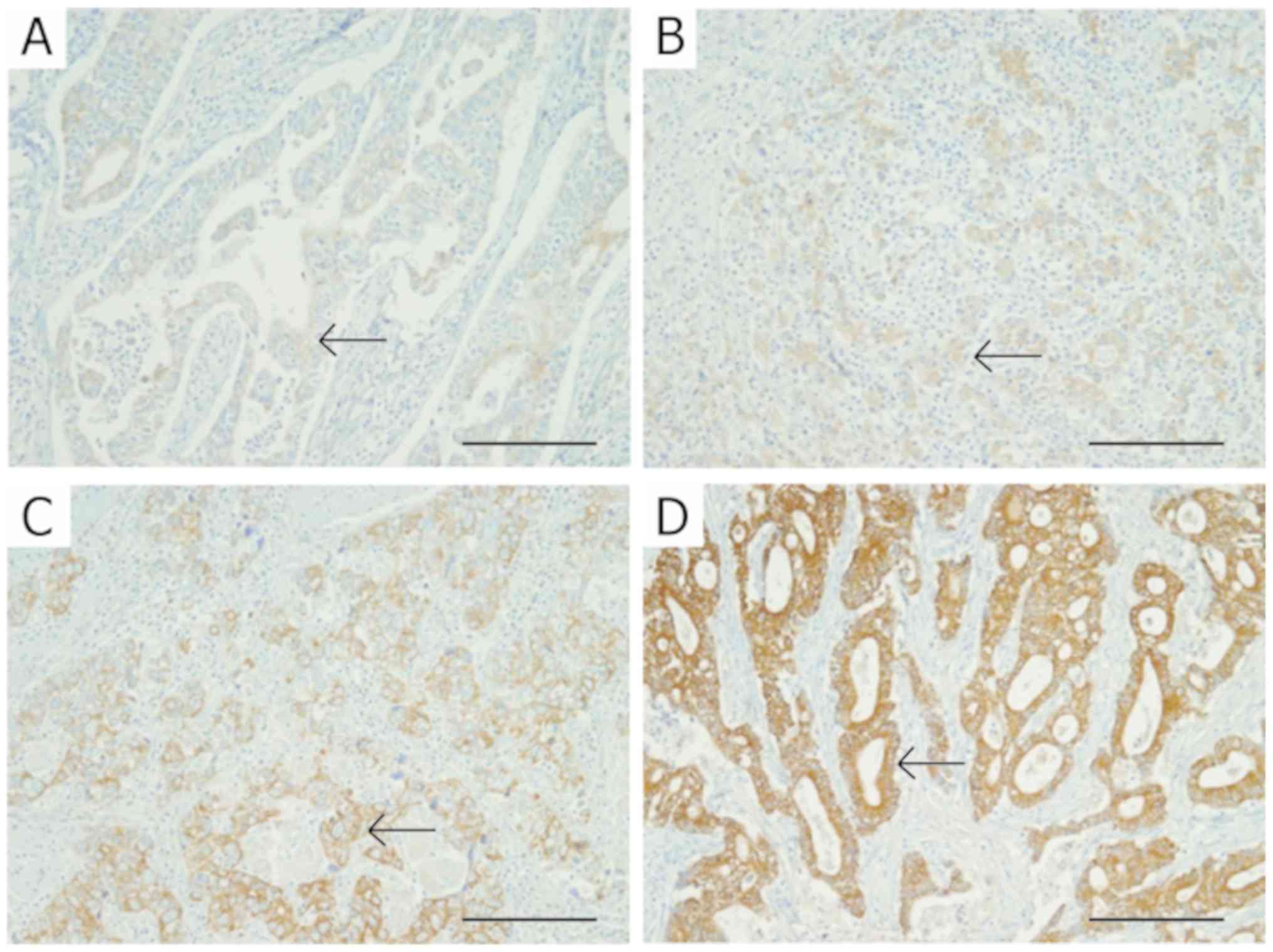 Immuno histochemistry staining of PRDX4 was performed using polyclonal anti-rabbit PRDX4 antibody (1:300; Abcam). Briefly, specimens were fixed in buffered formalin and embedded in paraffin according to routine procedures and then evaluated using a Dako detection kit (Dako). For this study, 5 µm sections were prepared, dried in a drying oven at 60°C for 1 h, deparaffinized and dehydrated using OTTIX reagents. Antigen was retrieved by incubating the slides for 15 min in a pressure cooker with citrate buffer (Dako Target Retrieval Solution). The slides were incubated with anti-PRDX4 antibody (1:1,000) in humidity chambers overnight at 4°C, washed in PBS (pH 7.4), and incubated with secondary antibody (Dako Real Envision/HRP, K5007) for 15 min at room temperature. The slides were counterstained in hematoxylin, dehydrated and mounted. Signal intensity was scored as the percentage of PRDX4-positive cells in the following manner: Score 0 (<1%), score 1 (1–25%), score 2 (25–49%), and score 3 (50–74%; Fig. 1).