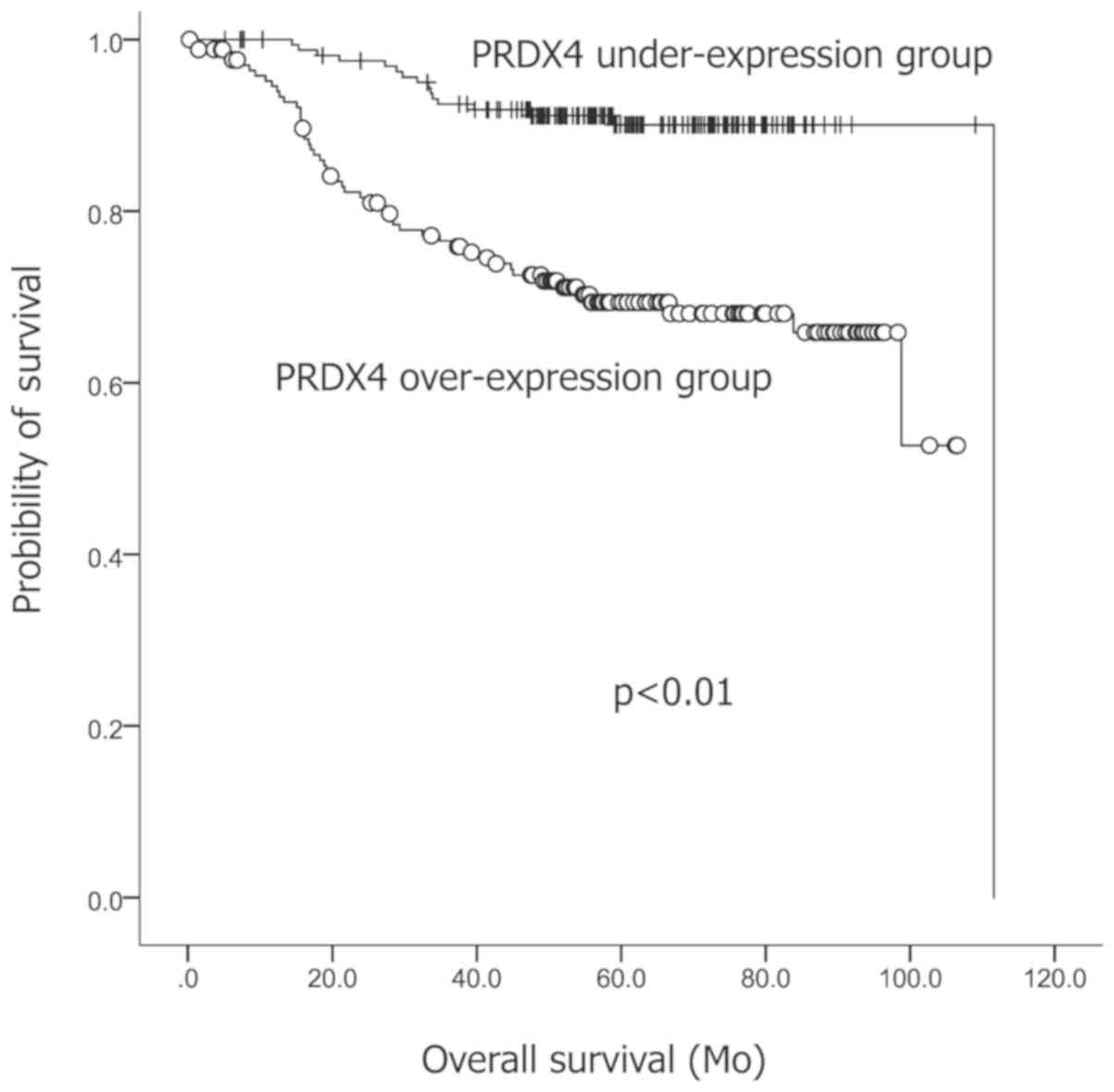 Table II.In the Cox Proportional hazard model, TNM stage and peroxiredoxin 4 were independent prognostic factors (P<0.05). |