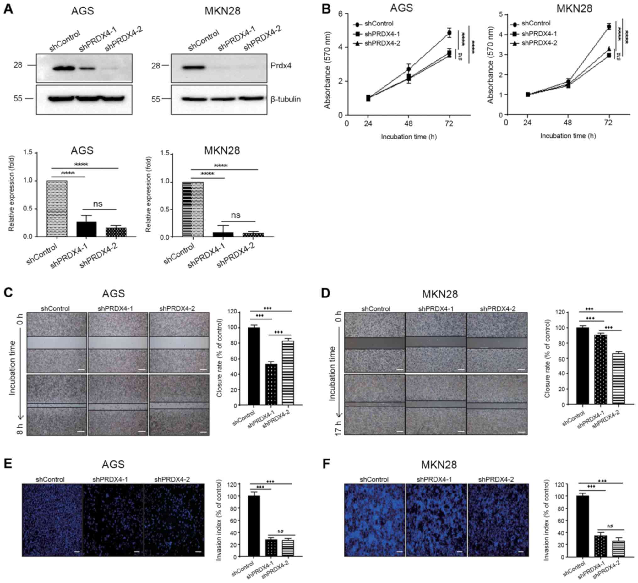 To explore the role of PRDX4 in stomach cancer, we utilized two human cell lines established from adenocarcinoma (AGS and MKN28 cells). We established stable stomach cancer cell lines to determine the potential mechanisms by which PRDX4 might promote metastasis in stomach cancer. To further investigate the effect of PRDX4 on cell proliferation, migration and invasion, we knocked down the expression of PRDX4 using PRDX4 shRNA in AGS and MKN28 cell lines. Western blot analysis of AGS and MKN28 control (denoted as sh-control) and PRDX4 knockdown (denoted as shPRDX4) cells demonstrated PRDX4 silencing in shPRDX4 cells. In the case of AGS, after knockdown of PRDX4, the expression levels of PRDX4-1 and PRDX4-2 were 25 and 15%, respectively. Additionally, in MKN28 cells, the expression levels of PRDX4-1 and PRDX4-2 were 8 and 7%, respectively, compared with the level (100%) of the control (P<0.0001, Fig. 3A). To study the role of PRDX4 on proliferation, the cells were examined via MTT assay. PRDX4 depletion induced a decrease in AGS proliferation compared to sh-control cells (76%, 72% vs. 100% of the control; P<0.0001, Fig. 3B). Additionally, PRDX4 depletion induced a decrease in MKN28 cell proliferation compared to sh-control cells (67%, 74% vs. 100% of control; P<0.0001, Fig. 3B). In the wound healing assay, the PRDX4-knockdown cells exhibited slower healing than the control cells at 8 h in the AGS cells (52.7%, 82.4% vs. 100% of control; P<0.001, Fig. 3C) and at 17 h in the MKN28 cells (90.7%, 66% vs. control 100%; P<0.001, Fig. 3D). The Transwell invasion assay showed that the number of invaded cells was lower in the PRDX4 knockdown group than the control group in both AGS cells (27.3%, 26.9% vs. 100% of control; P<0.001, Fig. 3E) and MKN28 cells (34.7%, 26.4% vs. 100% of control; P<0.001, Fig. 3F). The results of not only the Transwell invasion assay but also the wound healing assay indicated that the migration and invasion capabilities of stomach cancer cells were inhibited. Altogether, these results suggest that depletion of PRDX4 decreases the proliferation, migration and invasion of stomach cancer cells.