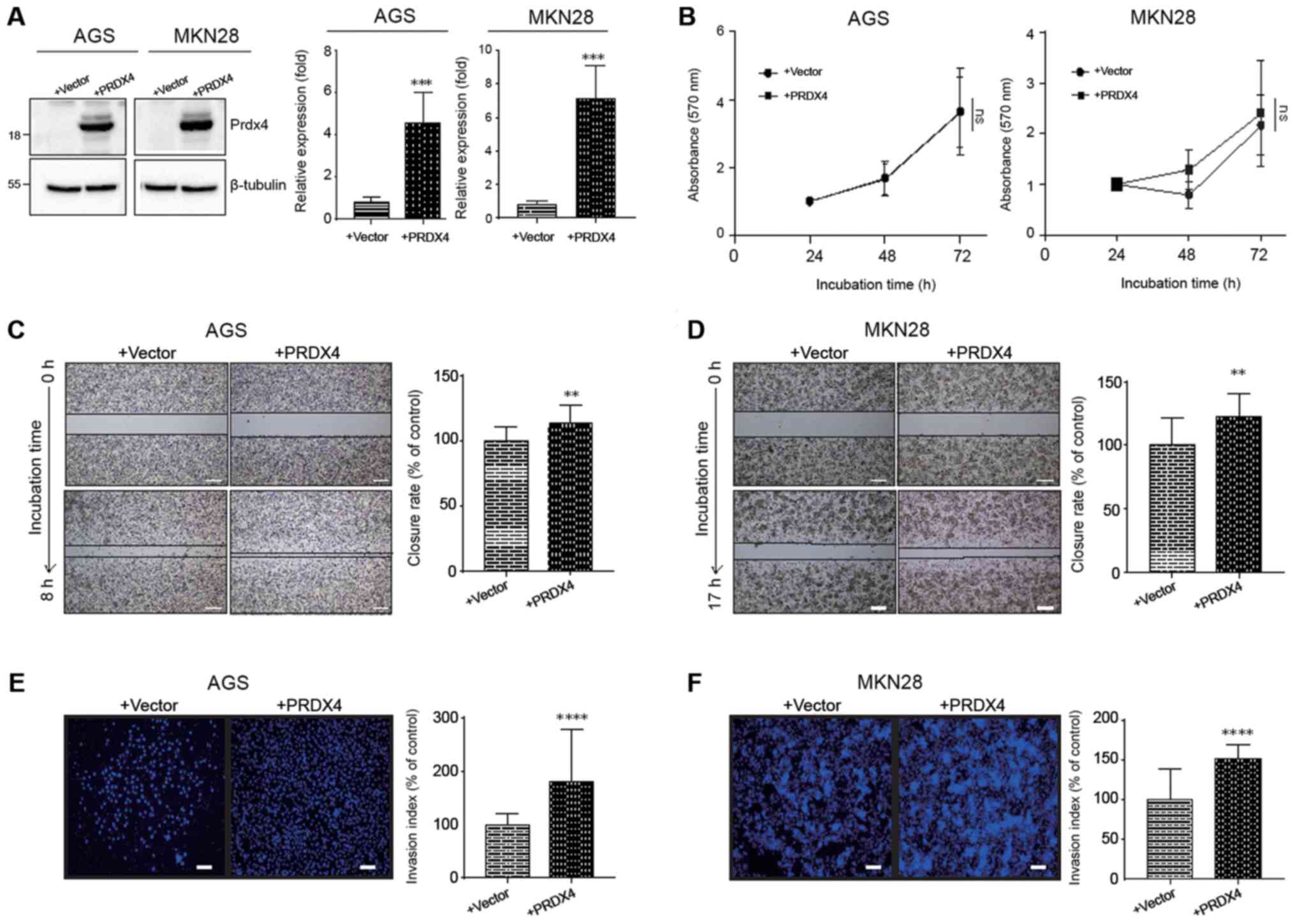 In conclusion, patients with PRDX4 overexpression in gastric cancer tissues show poor prognostic outcomes. The results of the present study suggest that PRDX4 is a marker of poor prognosis in gastric cancer and that PRDX4 is associated with cancer cell migration and invasion via EMT.