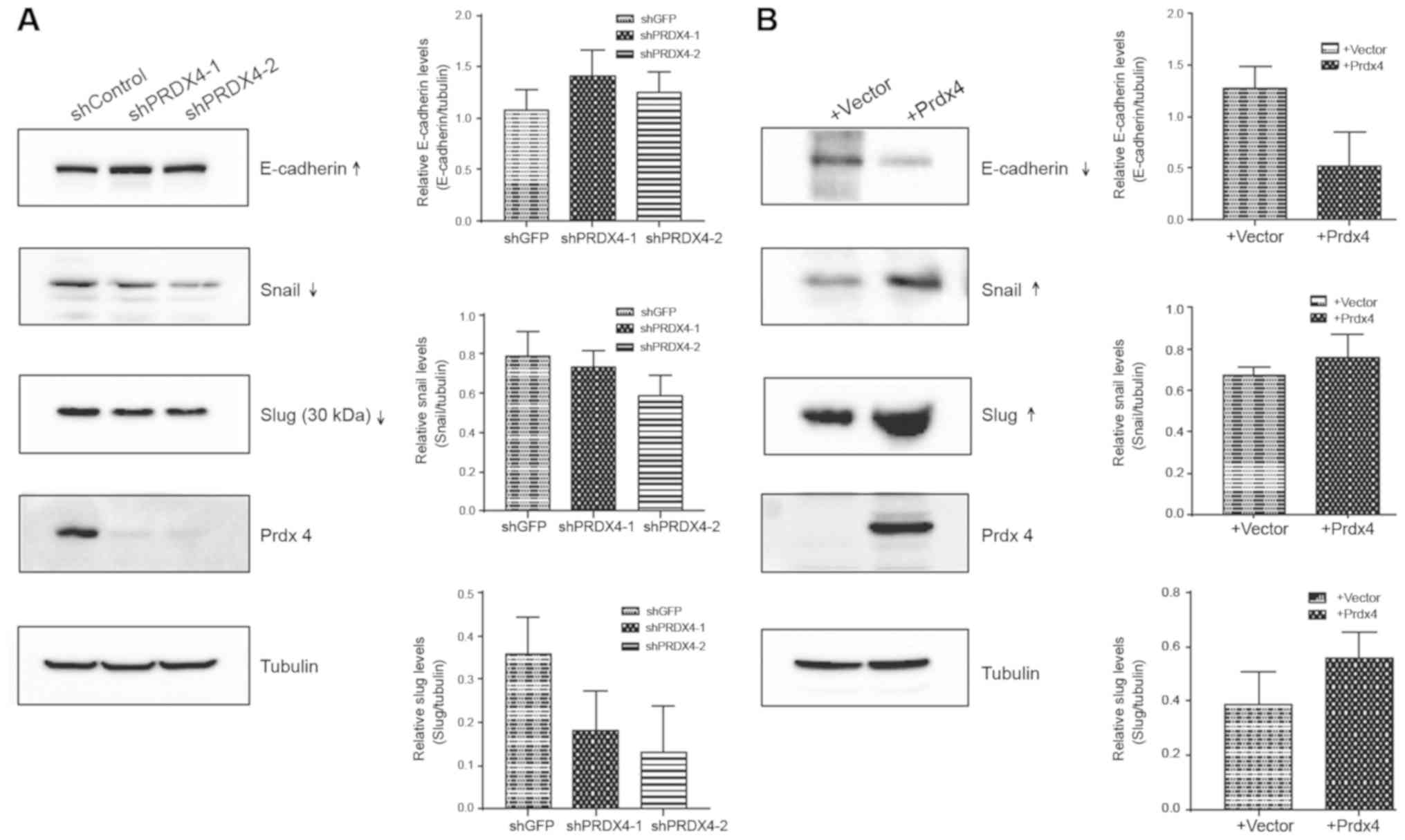 To investigate whether PRDX4 regulates EMT in stomach cancer cells, we measured the expression of key EMT markers. The effects induced by the alteration of PRDX4 activity on E-cadherin, snail and slug expression were examined in MKN28 cells only, as the expression of these markers in AGS cells was found to be unaffected (data not shown). PRDX4 knockdown led to increases in E-cadherin expression and decreases in snail and slug expression. Meanwhile, E-cadherin expression was found to decrease and snail and slug expression was found to increase in PRDX4-overexpression cells, indicating that PRDX4 expression might be correlated with EMT, as shown in Fig. 5.