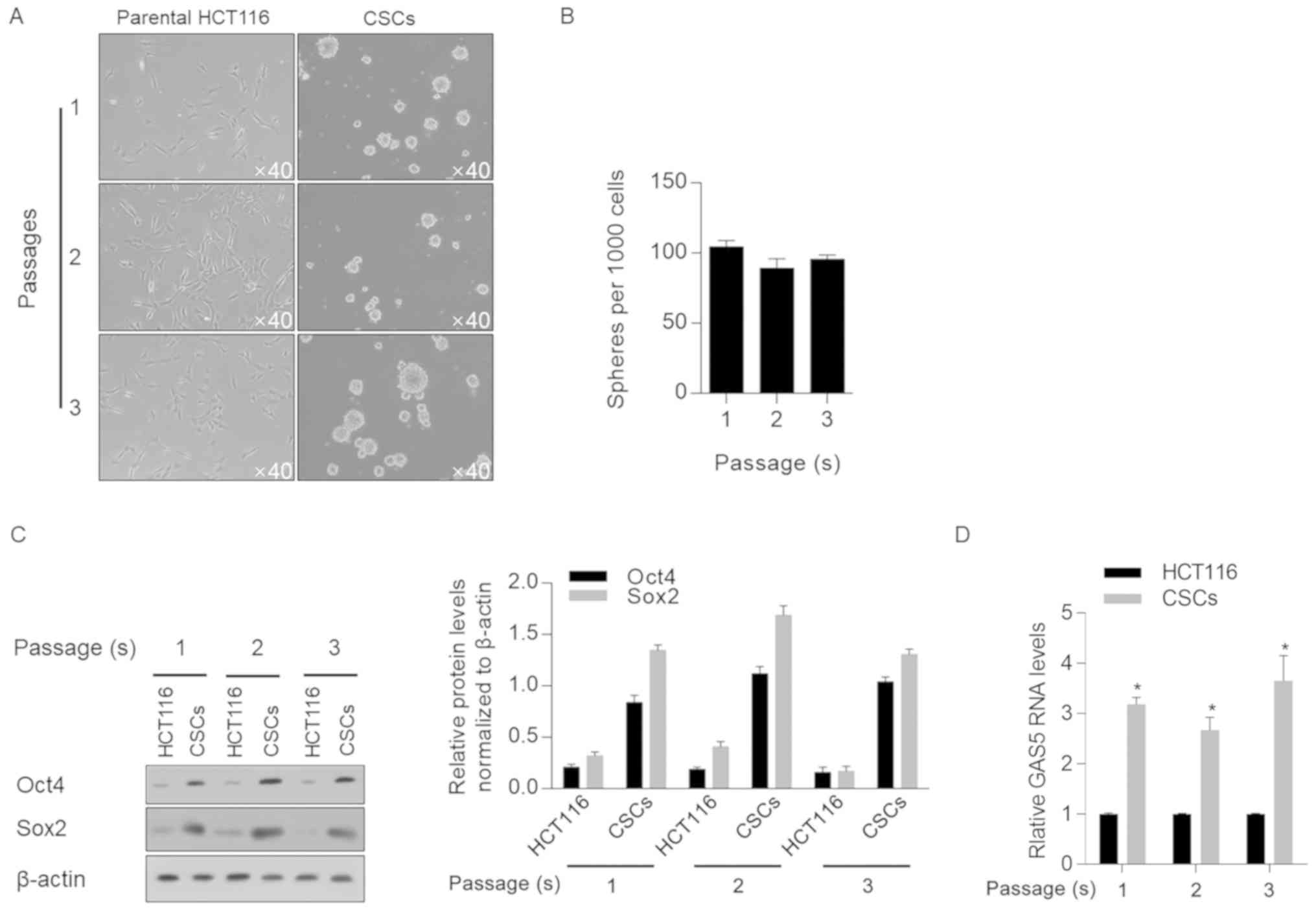 To further characterize the stemness of enriched cells, quantitative analyses were performed on Oct4 and Sox2, two stem cell factors that are important for the self-renewal properties of CSCs (29). An increase in the protein expression levels of Oct4 and Sox2 was identified in three passages of enriched cells compared with parental HCT116 cells (Fig. 1C). Subsequently, all three passages of CSCs were used to assess GAS5 mRNA expression; it was revealed that GAS5 was significantly upregulated in CSCs compared with parental HCT116 cells, regardless of the passage number (Fig. 1D).