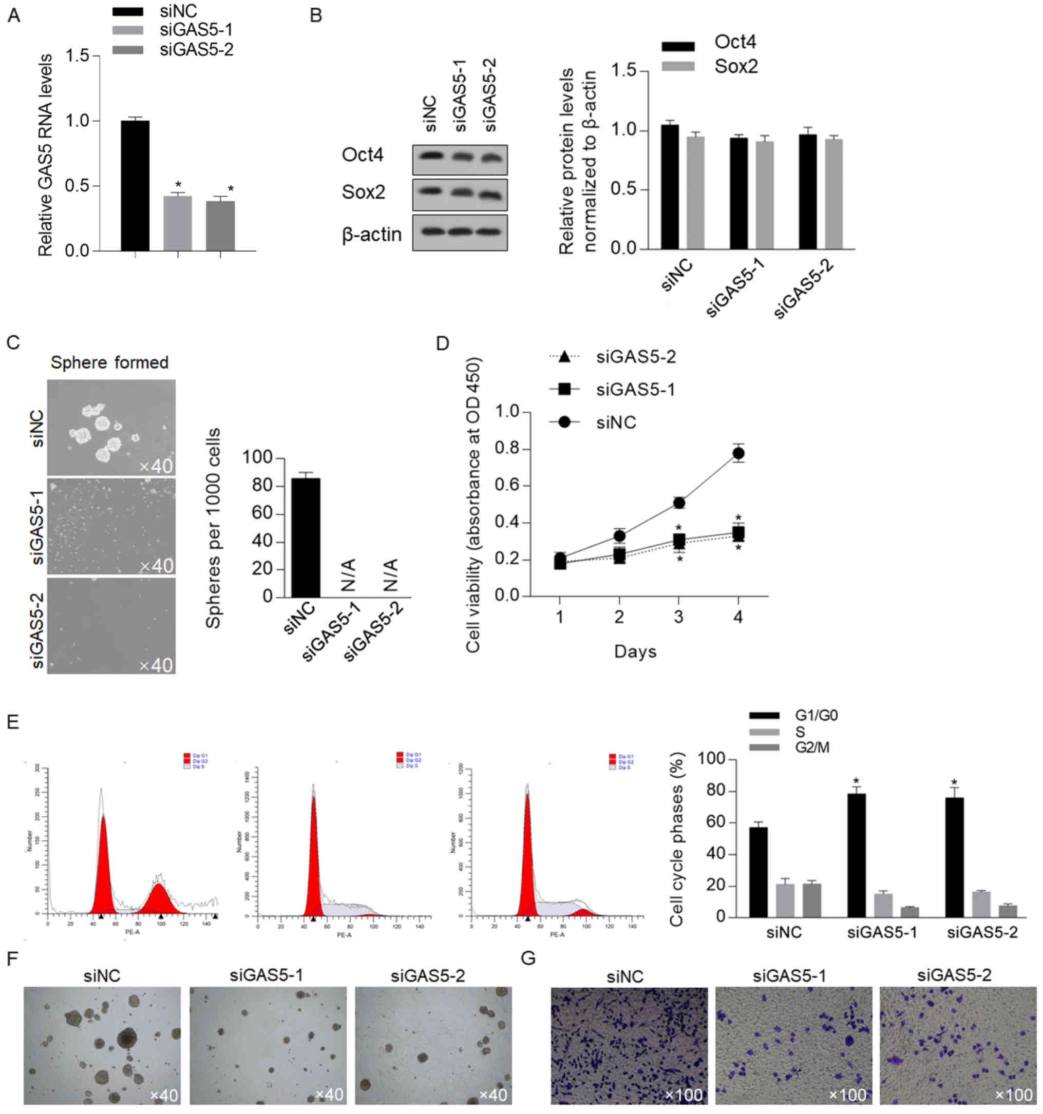 The effects of GAS5 on other malignant features were also detected, including tumor formation in soft agar and cell migration. It was revealed that knockdown of GAS5 inhibited these two malignant features (Fig. 2F and G), which suggested its important role in regulating physiological processes in CSCs.