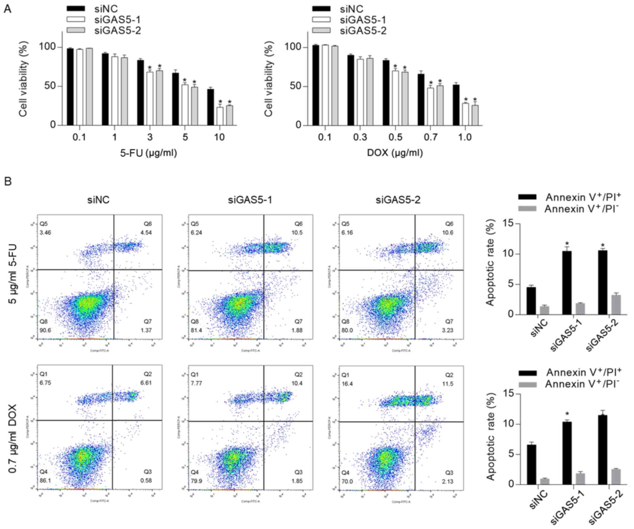 Previous studies have revealed that GAS5, which acts as a tumor suppressor, increased chemosensitivity in several types of cancer, including cervical cancer (21), ovarian cancer (31), pancreatic cancer (22) and clear cell renal cell carcinoma (23). To assess whether knockdown of GAS5 exerted a regulatory role in CSC chemosensitivity, the cytotoxicity of 5-FU and DOX to CSCs was measured, and it was identified that knockdown of GAS5 significantly sensitized CSCs to 5-FU and DOX (Fig. 3A). Moreover, 5 µg/ml 5-FU or 0.7 µg/ml DOX were supplemented into medium for 24-h treatment followed by apoptosis analysis. In line with the cytotoxicity results, it was revealed that GAS5 knockdown significantly increased chemotherapeutic treatment-induced apoptosis (Fig. 3B).