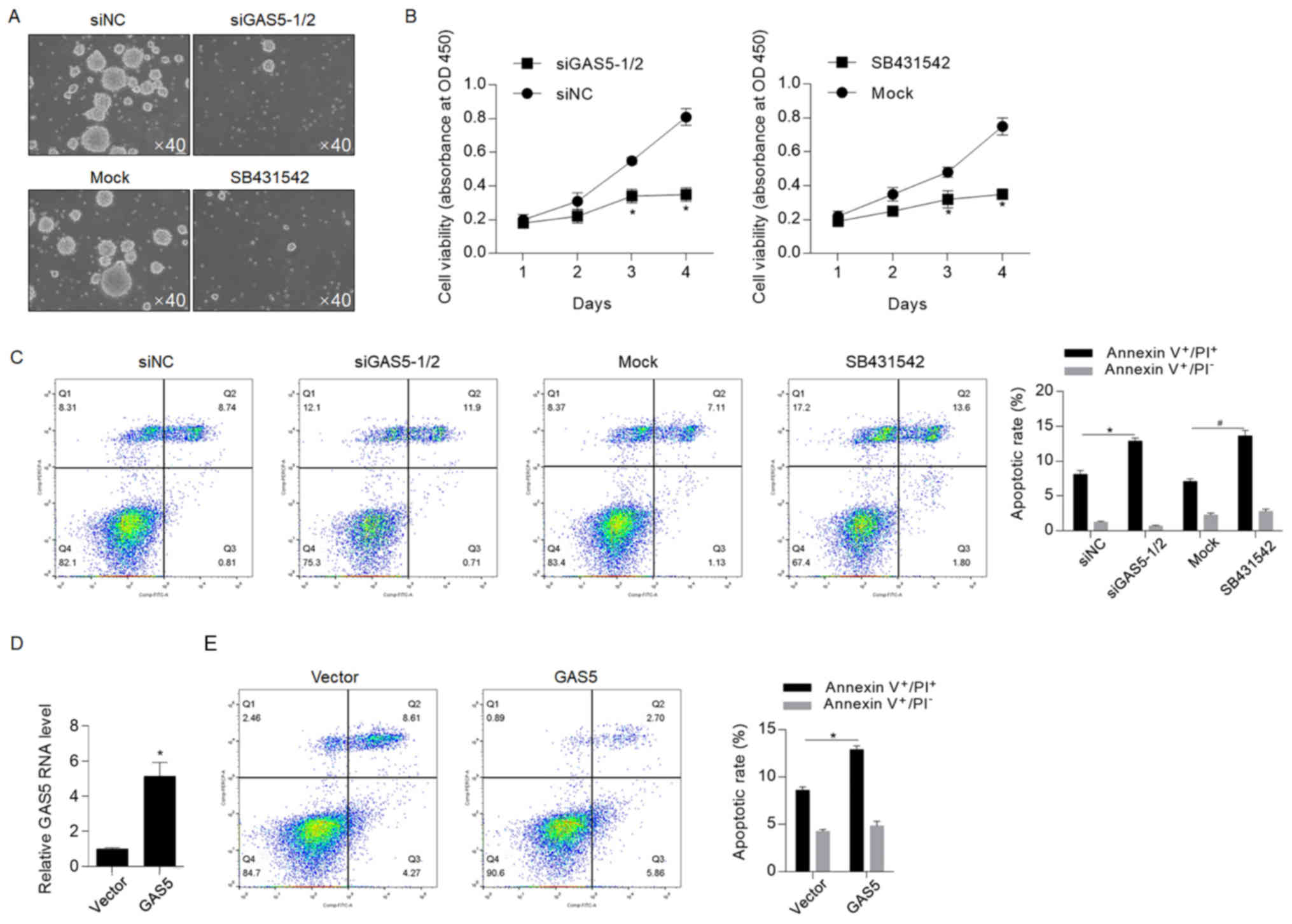 NODAL signaling has been reported to be regulated by GAS5, helping to maintain stemness (30). Therefore, the present study aimed to identify whether NODAL was involved in GAS5-mediated regulation of CSCs. The serial replating assay demonstrated that GAS5 knockdown and pretreatment with SB431542 significantly decreased self-renewal capacity in CSCs, thus indicating that both of these are important for maintaining stemness (Fig. 4A). The cell viability assay also suggested that GAS5 knockdown and inhibition of NODAL signaling via SB431542 decreased cell proliferation (Fig. 4B). To further assess whether NODAL signaling contributed to GAS5 knockdown-induced chemosensitivity, the apoptotic rate after 5-FU treatment was measured, and it was revealed that inhibition of NODAL signaling sensitized CSCs to chemotherapeutic treatment (Fig. 4C). However, this finding was inconsistent with those from previous studies, which reported the anti-tumor effects of GAS5 (21–23,31). To assess whether GAS5 exerts different effects on HCT116 cells, GAS5 was efficiently overexpressed in HCT116 cells (Fig. 4D) and apoptotic cell death was detected (Fig. 4E). Flow cytometry results indicated that, in HCT116 cells, overexpression of GAS5 sensitized cells to chemotherapy, thus suggesting that GAS5 potentially exerts opposite effects on chemoresistance in HCT116 cells and CSCs derived from HCT116.