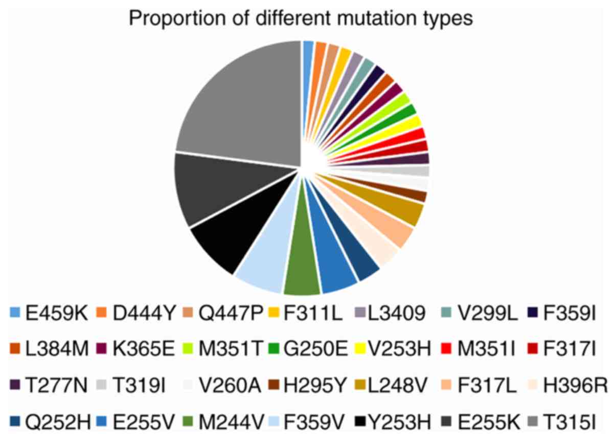 T315I is located in the ATP-binding domain (13), which is the most frequent mutation, and is resistant to currently available TKIs. The frequency of the T315I mutation was analysed in the present study, as well as focusing on compound mutants and polyclonal mutants. Compound mutations are mutations affecting two or more amino acid residues in the same BCR-ABL molecule BCR-ABL molecule (6). Multi-TKI failure leads to the emergence of compound mutants. To date, 60 different compound mutants in BCR-ABL1 have been reported to be associated with TKI resistance (14,15). Polyclonal mutations are defined as two or more missense mutations in different BCR-ABL1 molecules (8).