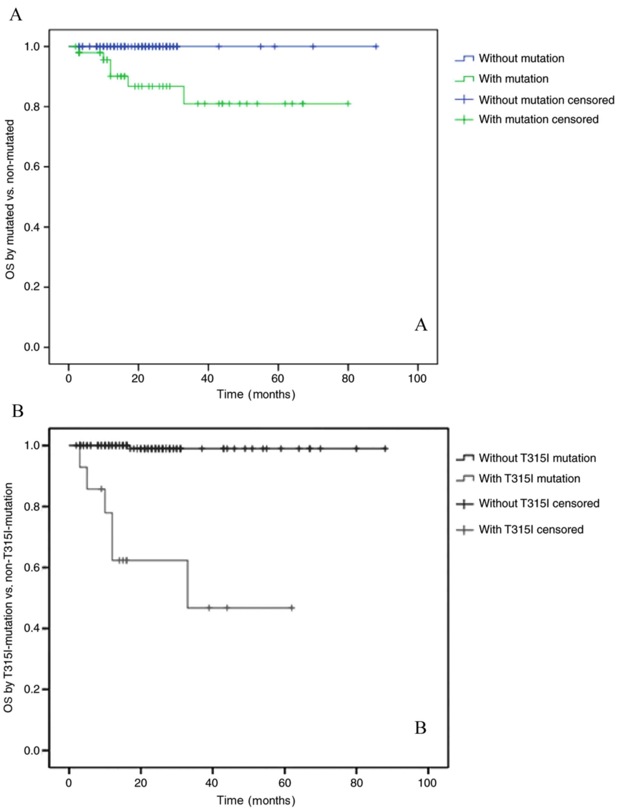 The T315I mutation was detected in patients. Among all patients, T315I was the most frequently detected mutation in the present study, and this mutation was also associated with OS. The patients who presented with the T315I mutation responded poorly to chemotherapy. Only one patient, aged 28 years at diagnosis, achieved molecular remission following allo-HSCT. In addition, two patients benefited from ponatinib, although with notable toxicity. A total of five patients died despite receiving chemotherapy. Ponatinib has been described as an effective treatment for patients with the T315I mutation (22). These results were similar to those reported in the literature (6).