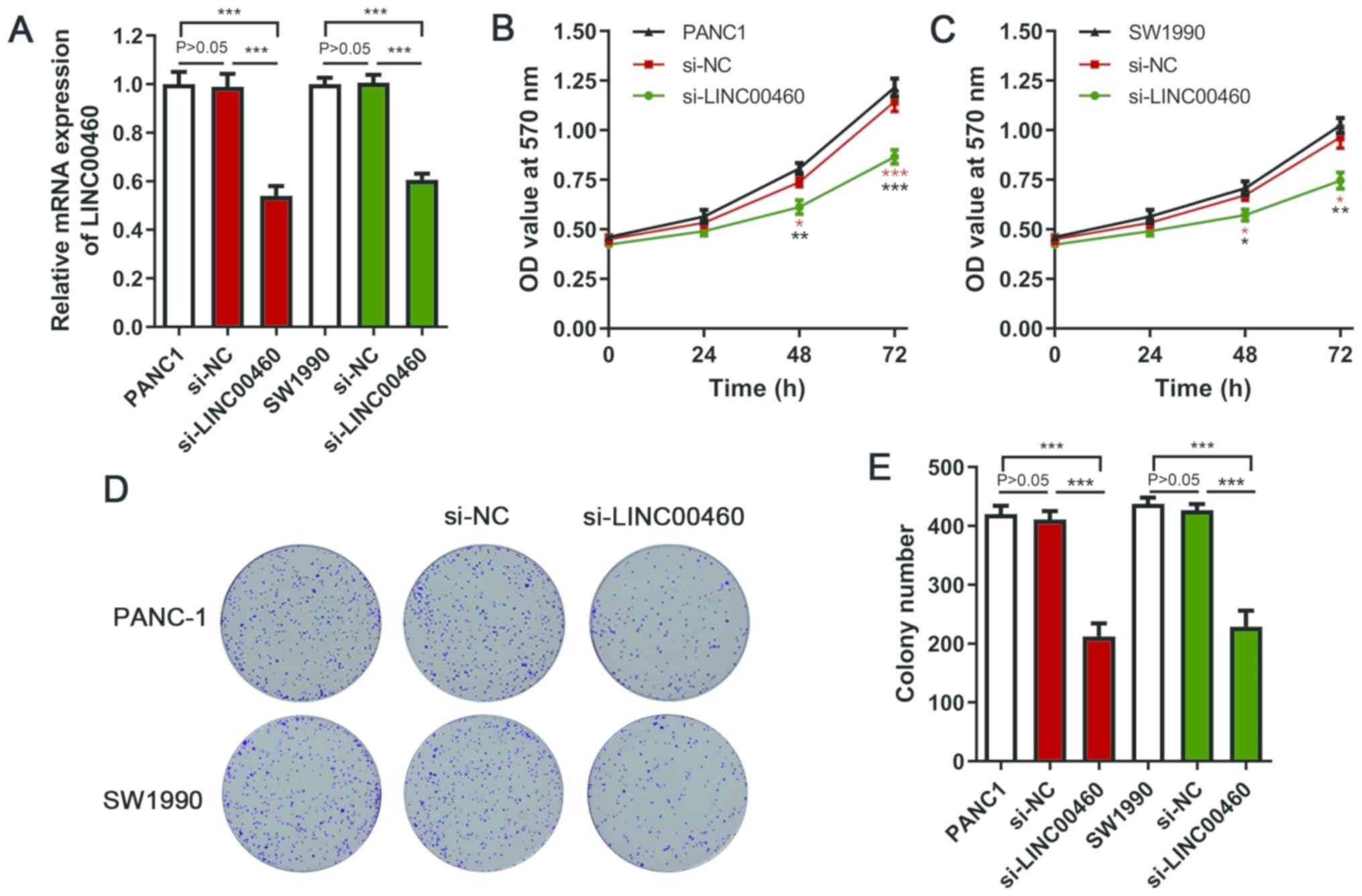 The human PC PANC1 and SW1990 cell lines were purchased from Wuhan Boster Biological Technology, Ltd., and were cultured in DMEM supplemented with 10% FBS (both Thermo Fisher Scientific, Inc.) and 1% penicillin/streptomycin at 37°C with 5% CO2. The siRNA oligos (si-LINC00460; 5′-GUGUCAACAACCUGUUUAAUU-3′) and the negative control (si-NC; 5′-UUCUCCGAACGUGUCACGUTT-3′) were purchased from Guangzhou RiboBio Co., Ltd. PANC1 and SW1990 cells were transfected with 100 nM siRNA using Lipofectamine® 2000 (Invitrogen; Thermo Fisher Scientific, Inc.) according to the manufacturer's protocol. Subsequent experiments were conducted 48 h after siRNA transfection.