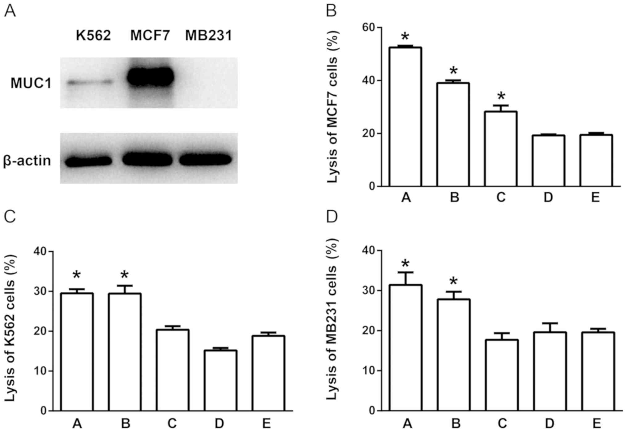 To observe the antigen effect of the T7-MUC1 conjugate, the present study developed a DC-CIK co-culture procedure using human samples. DCs and CIKs were cultured separately, and the T7-MUC1 conjugate was added as an antigen on day 3 and 5 to the DC culture. Then, DCs and CIKs were co-cultured on day 7, and the CTL effect was measured on day 14. Western blotting results for the three types of human tumor cells, MCF-7, MB231 and K562, demonstrated high protein expression levels of MUC1 in MCF-7 cells, whereas K562 and MB231 cells exhibited relatively low MUC1 expression; MB231 cells expressed undetectable levels of MUC1 protein (Fig. 3A). The CTL results demonstrated that the conjugate-induced CTLs exerted a more potent effect on MCF-7, but not K562 and MB231 cells (Fig. 3B-D). Therefore, it was speculated that the conjugate-induced CTLs exerted increased target cell cytotoxicity, and this effect was partially dependent on the expression of MUC1 in the target cells.