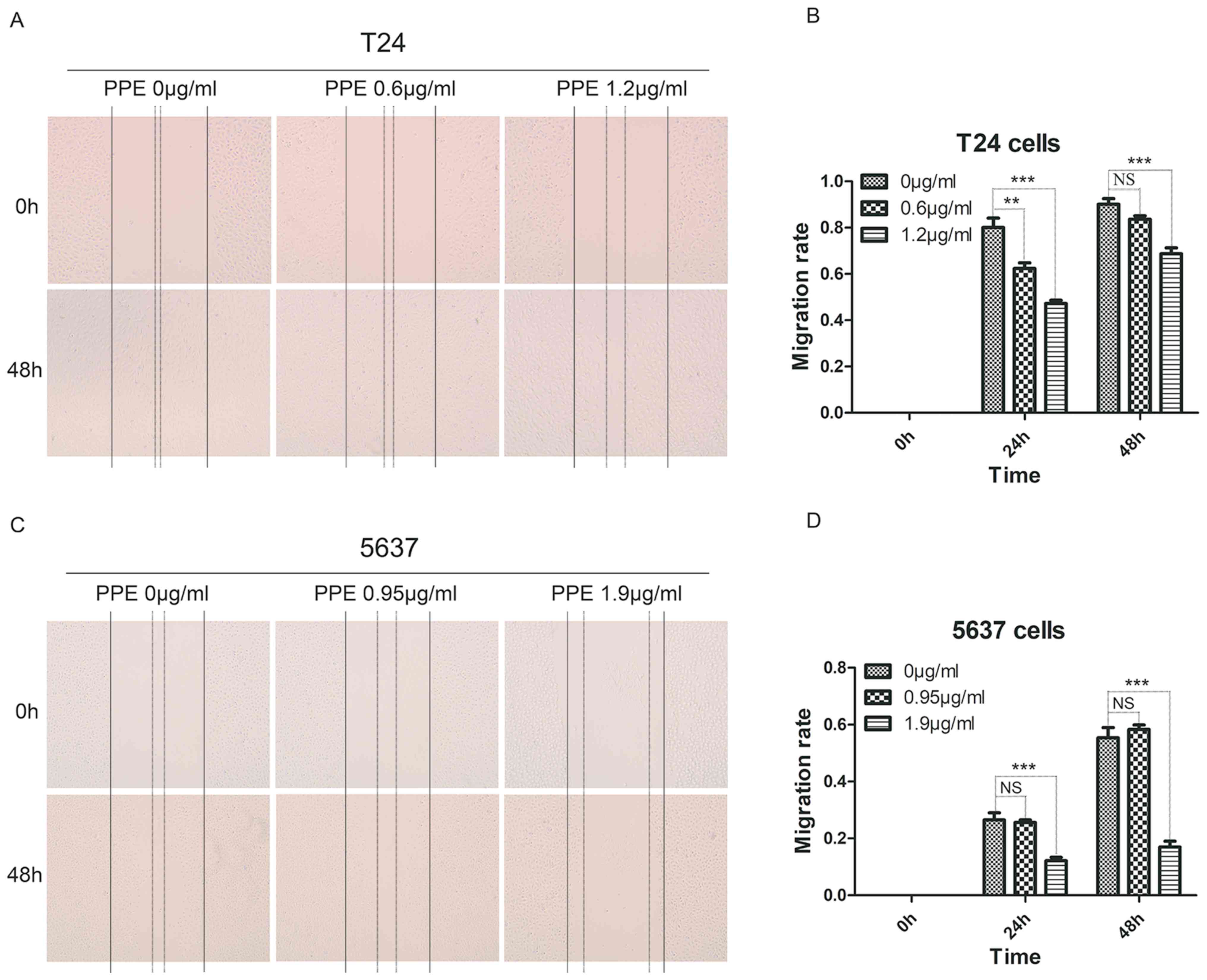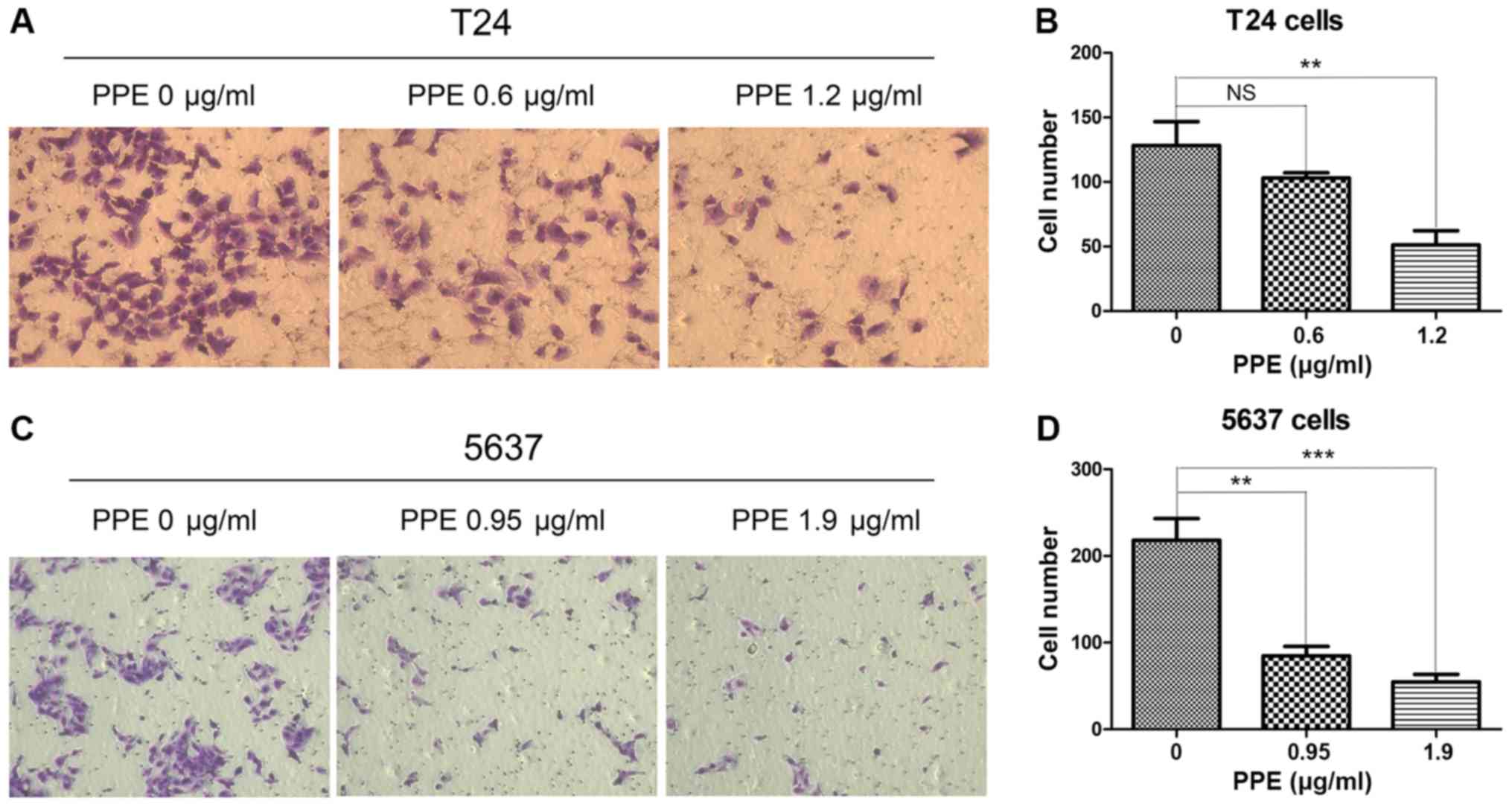 To investigate the effects of PPE on bladder cancer invasion and migration, wound healing and Transwell assays were performed in T24 and 5637 cells treated with PPE. The results revealed that PPE significantly suppressed the wound closure of T24 cells at 1.2 µg/ml (Fig. 2A and B) and 5637 cells (Fig. 2C and D) at 1.9 µg/ml (P<0.001). The effect of PPE on the invasiveness of bladder cancer cells was further examined, and the results demonstrated that PPE suppressed the invasive ability of T24 (Fig. 3A and B, P<0.01 at 1.2 µg/ml) and 5637 (Fig. 3C and D, P<0.01 at 0.95 µg/ml and P<0.001 at 1.9 µg/ml) cells compared with that of the control group. Therefore, PPE inhibited the invasive and migratory abilities of T24 and 5637 bladder cancer cells.