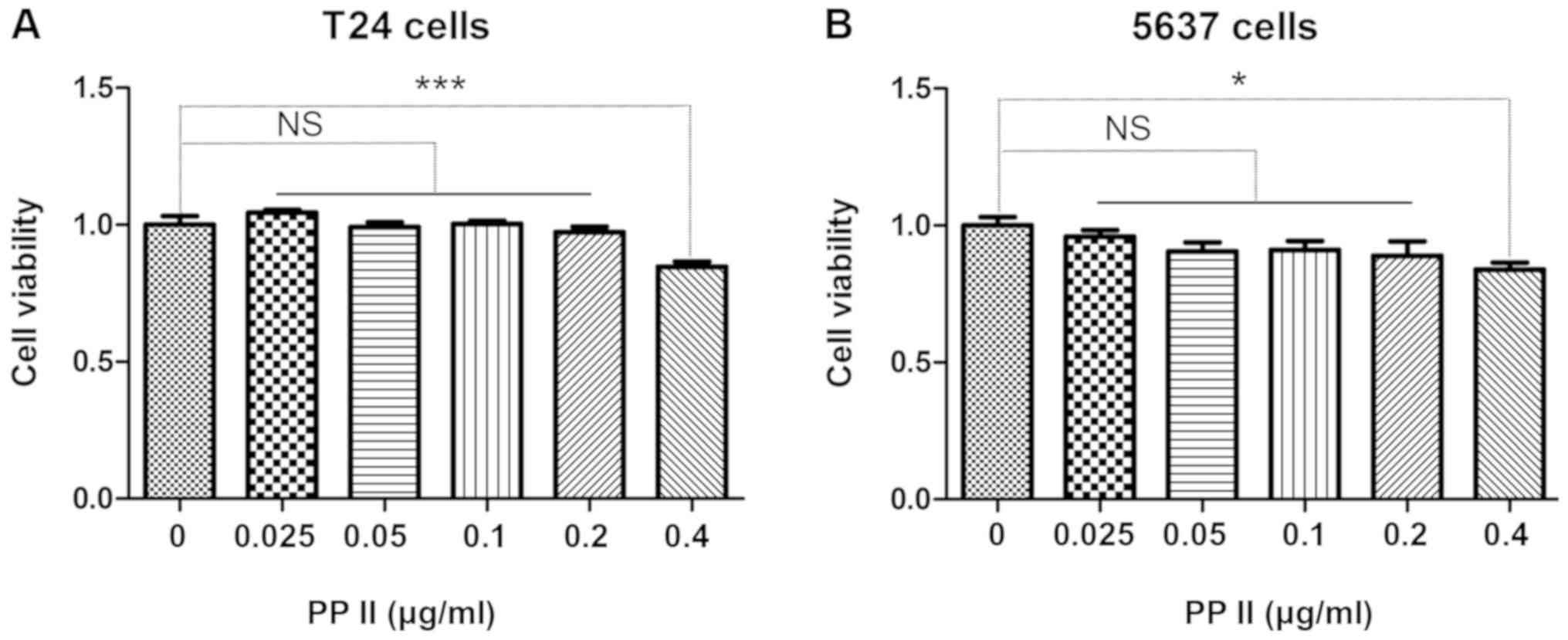 The bladder cancer cells T24 (Fig. 4A) and 5637 (Fig. 4B) were treated with 0, 0.025, 0.05, 0.1, 0.2 or 0.4 µg/ml PPII for 48 h. The viability of bladder cancer cells was inhibited when the concentration of PPII was 0.4 µg/ml (P<0.05). Therefore, the antimetastatic activity of PPII was further analyzed using 0, 0.1 and 0.2 µg/ml PPII.