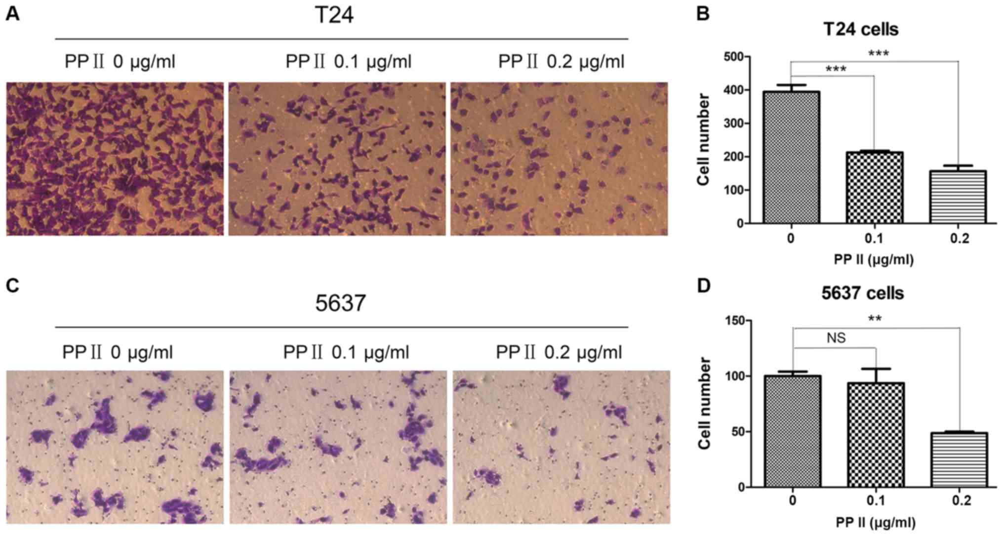 To further investigate the effects of PPII on bladder cancer cell migration and invasion, T24 and 5637 cells were treated with 0, 0.1 and 0.2 µg/ml PPII for 48 h. Cell migration was analyzed using a wound healing assay. PPII significantly inhibited the migratory rates of T24 cells at 0.2 µg/ml (Fig. 5A and B; P<0.05) and 5637 cells at 0.2 µg/ml treated for 48 h (Fig. 5C and D; P<0.01) compared with those in the control group. The invasive ability of bladder cancer cells was examined by a Transwell assay. The results indicated that PPII also significantly decreased the ability of T24 cells (Fig. 6A and B; P<0.001) and 5637 cells at 0.2 µg/ml (Fig. 6C and D; P<0.01) to traverse the membrane. These results suggested that PPII may inhibit the invasive and migratory abilities of bladder cancer cells.
