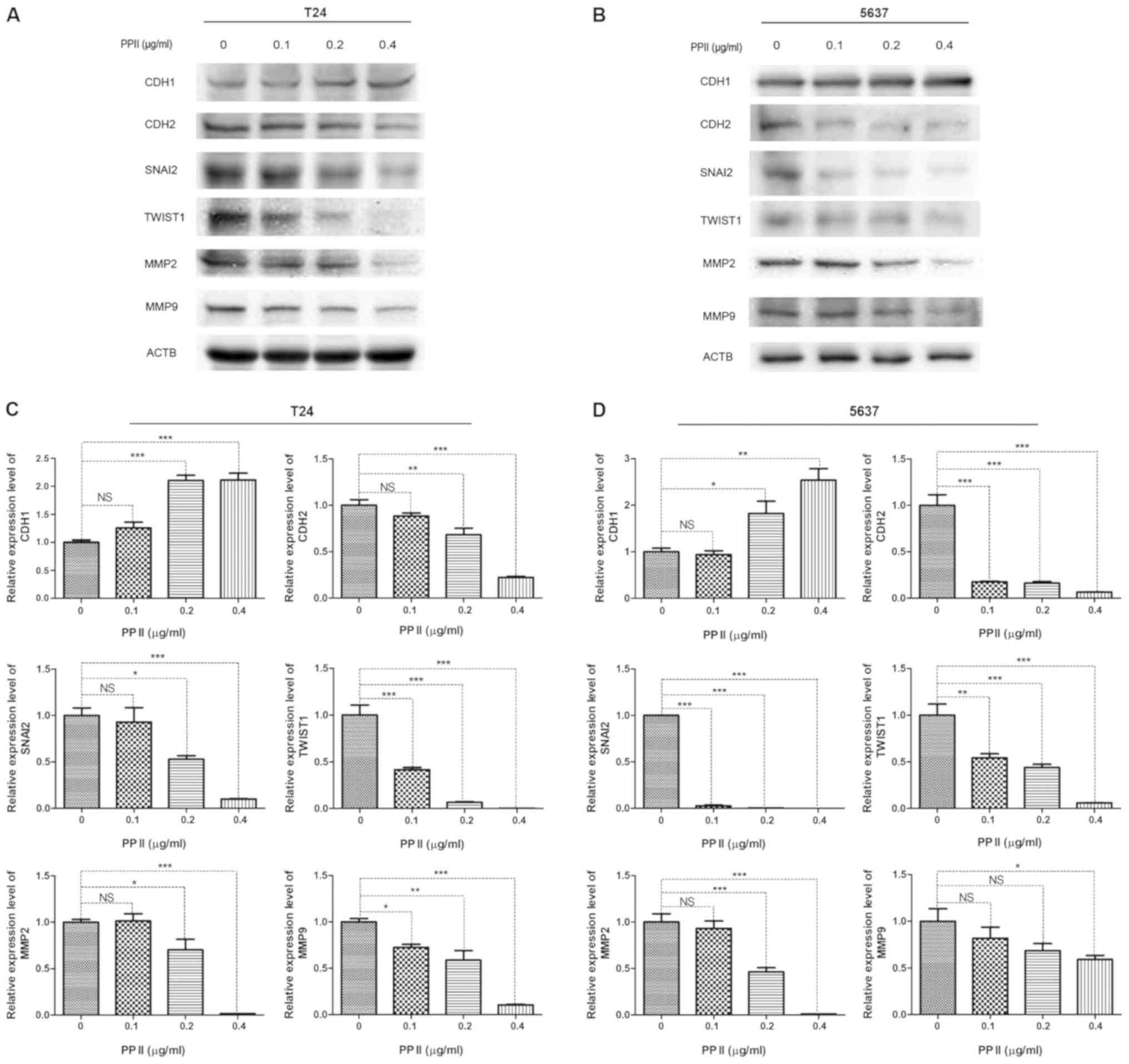 Since EMT-inducing transcription factors promote cancer metastasis, the present study examined whether PPII inhibited bladder cancer migration and invasion by regulating the expression of EMT-associated proteins. As markers of EMT, the expression levels of CDH1 and CDH2 were detected by western blot analysis. The results demonstrated that the expression of CDH1 in T24 (Fig. 7A) and 5637 (Fig. 7B) cells was significantly increased following PPII treatment, whereas that of CDH2 was decreased compared with the control group. In addition, the expression levels of the transcriptional repressors of CDH1, including SNAI2 and TWIST1, were decreased in PPII-treated cells compared with those in the untreated control group (Fig. 7C and D). The expression levels of gelatinases MMP2 and MMP9, which serve crucial roles in maintaining extracellular matrix homeostasis and tumor invasion, were also significantly inhibited by PPII compared with those in the control group (Fig. 7C and D). These results suggested that PPII-induced migration and invasion inhibition may occur through the suppression of EMT and MMPs expression.