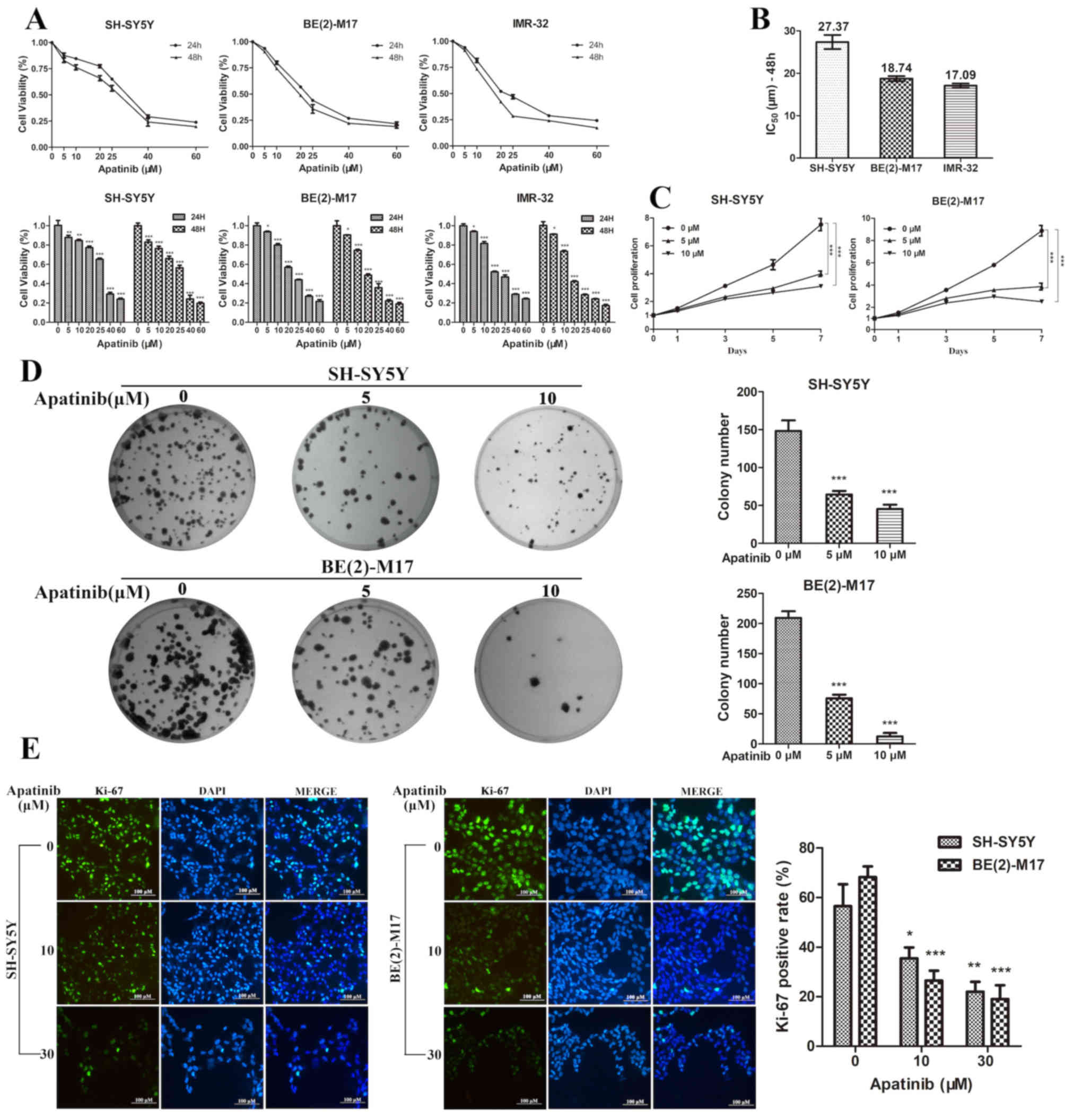 To determine the antitumor effects of apatinib on NB cells, the NB cell lines BE(2)-M17, SH-SY5Y and IMR-32 were cultured with different concentrations of apatinib. The CCK-8 assay revealed that the viability and proliferation of NB cells were significantly inhibited by apatinib in both a dose- and time-dependent manner (Fig. 1A and C). At 48 h, the IC50 of apatinib was 18.74 µM for BE(2)-M17 cells, 27.37 µM for SH-SY5Y cells and 17.09 µM for IMR-32 cells (Fig. 1B). Neuroblastoma is frequently associated with the presence of MYCN amplification, a genetic biomarker for poor prognosis (4). The SH-SY5Y cell line without MYCN amplification and BE(2)-M17 cell line with MYCN amplification were selected for further experimentation. Subsequently, BE(2)-M17 and SH-SY5Y cells were treated with apatinib for 48 h and then seeded into 6-well plates for 14 days. Apatinib significantly decreased the colony formation efficiency of BE(2)-M17 and SH-SY5Y cells (Fig. 1D). In addition, the immunofluorescence assay demonstrated that the expression level of Ki-67 was significantly decreased following apatinib treatment (Fig. 1E). These results indicated that apatinib may inhibit the growth of NB cells in vitro.