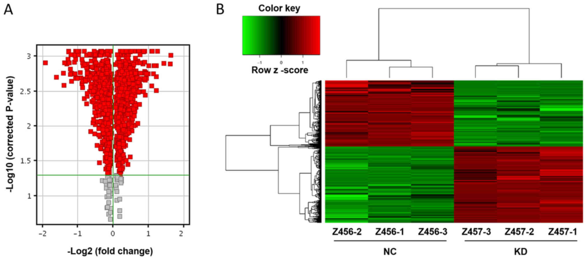 The Oncomine and GEO databases were searched for PCa gene expression level data, which demonstrated that the expression level of the GAB2 gene was higher in PCa tissues than in benign prostatic hyperplasia tissues (Fig. 1A and B). These results indicate that GAB2 may be an oncogene of PCa and possess regulatory effects on tumor development. The GAB2 gene was knocked down in PC-3 human PCa cells and gene chip technology was used to compare gene expression levels. GAB2 gene knockdown efficiency in the KD group was 60.7%, compared with GAB2 gene expression levels in the NC group (Fig. 1C). The scatter plot demonstrates the distribution of signal values between the experimental and control groups on the plane of the rectangular coordinate system. The ordinate and abscissa values of each point represent the expression level value of a probe in the experimental and control groups, respectively. The upper part of the green line indicates KD is downregulated relative to NC; the lower part of the green line indicates KD is upregulated relative to NC (Fig. 1D). The red dots on the volcano map indicate genes with fold difference >1 and significance level <0.05 (Fig. 2A). The points to the left of X=−1 and to the right of X=1 are genes with differences >2-fold. The majority of gene expression level changes are notably different and differ >2-fold (Fig. 2A). The heat map shows the expression levels of genes in each sample (Fig. 2B). Green indicates a relatively decreased signal value; black indicates a moderate signal value; gray indicates that the signal value was not detected. In the tree structure, two adjacent samples or genes have higher similarity. The expression profiles of the KD and NC groups are notably different (Fig. 2B). The results demonstrated significant differences in 1,242 genes; 665 genes in the KD group were upregulated, and 577 were downregulated compared with the NC group.