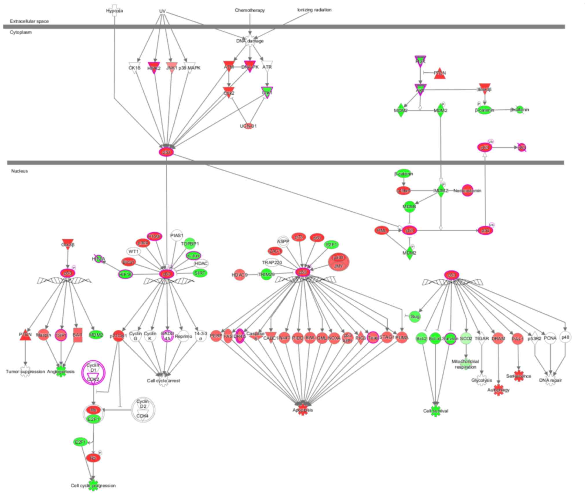 After determining the differential gene expression levels in the KD and NC groups, the differential gene results of the chip analysis, including probe number and fold-change were introduced into the IPA online integration analysis tool. The software further analyzed the molecular pathways activated or inhibited by GAB2 gene knockdown to predict upstream regulatory molecules, analyze the association between disease and function, and determine the network of gene interactions in order to provide novel insights into the progression of PCa. Previous findings have demonstrated that activation of the p53 signaling pathway leads to cell cycle inhibition and apoptosis in PCa cells (19,20). Singh et al (21), reported that targeting the p53 pathway can inhibit PCa cell proliferation and metastasis (22,23). The present study demonstrated that GAB2 gene expression levels are upregulated in PCa cells, but the association between GAB2 and the p53 signaling pathway has not yet been reported. In the present study, p53 signaling in PCa cells was suppressed following GAB2 knockdown, but DNA-PK was abnormally expressed in the p53 signaling pathway. By contrast, Dylgjeri et al (24) demonstrated that pharmacological targeting of DNA-PK inhibits tumor growth both in vitro and in vivo. This difference may be because the complex molecular networks within tumor cells have not yet been elucidated. In addition to DNA-PK, Chk1, AKT, TSP1, and DR4/5 were also abnormally expressed following GAB2 knockdown; the involvement of these molecules in PCa should be further investigated.