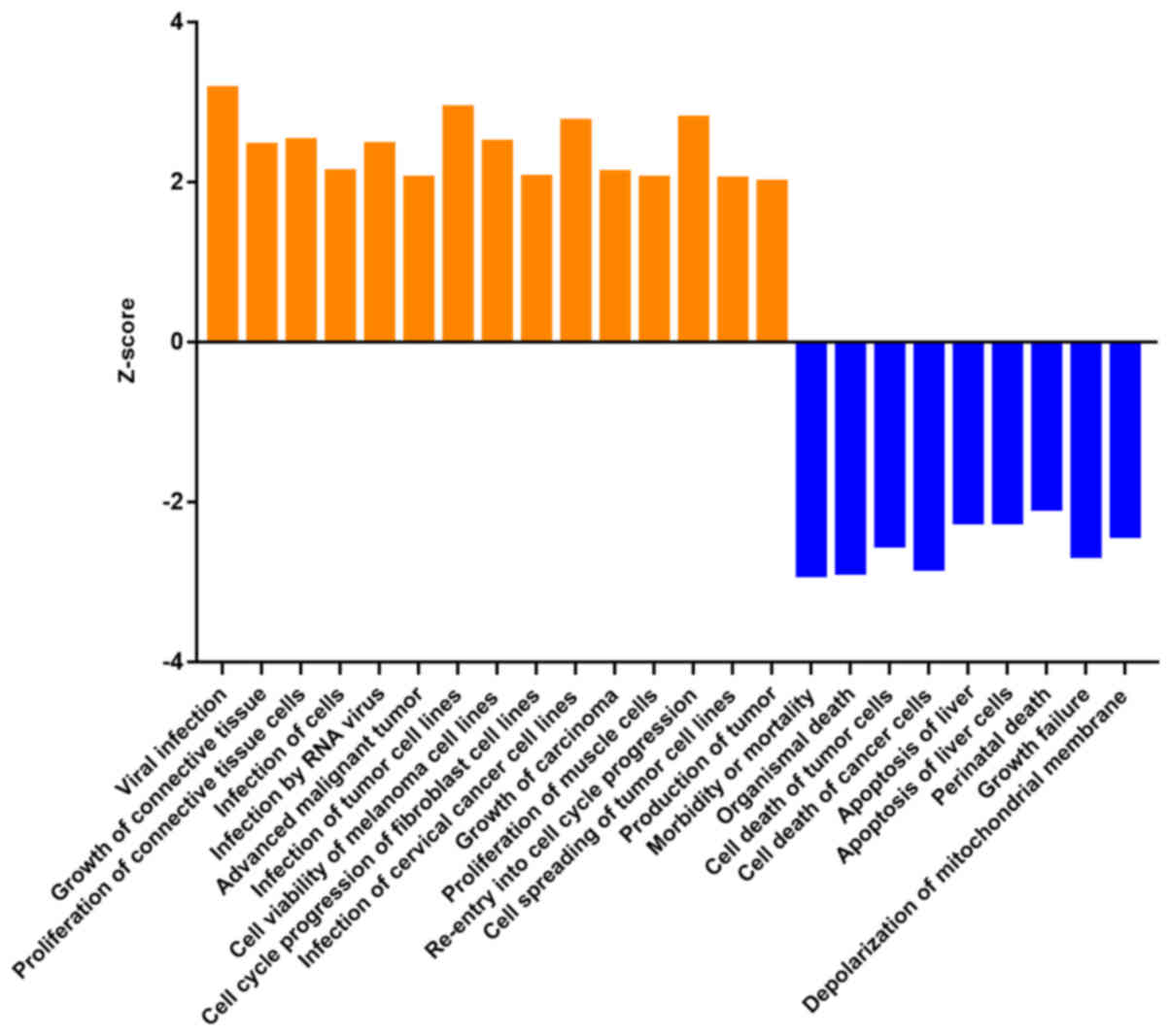 Up- and downregulation of differential gene expression levels are associated with activation or inhibition of functions and diseases. IPA software was used to analyze the changes of 500 functions (Table SII). Z-score >2 means that the function is significantly activated, and Z-score <-2 means that the function is significantly inhibited. A total of 24 functions changed significantly, including ‘viral infection’ (Z-score=3.176) and ‘infection of tumor cell lines’ (Z-score=2.934). The functions with significant inhibition were ‘morbidity or mortality’ (Z-score=−2.906) and ‘organismal death’ (Z-score=−2.879) (Fig. 7). The regulatory effect network map shows the interaction between genes and regulators and functions in the data set. In the present study, mouse double minute 2 homolog, methyl-CpG-binding protein 2 and SAM pointed domain containing ETS transcription factor possessed an activating effect on advanced malignant tumor, melanoma cell line viability and muscle cell proliferation, as well as an inhibitory effect on cancer cell death via β-actin, survivin, dipeptidyl peptidase 4, hypoxia inducible factor 1α, homeodomain-interacting protein kinase 2, immunoglobulin heavy constant µ, interleukin-1 receptor-associated kinase 1, lysine acetyltransferase 2B, prostate specific antigen, protein tyrosine phosphatase receptor type F, syndecan 1, SMAD4, thrombospondin 1, TP53, vascular endothelial growth factor A, vimentin and other genes (Fig. 8).
