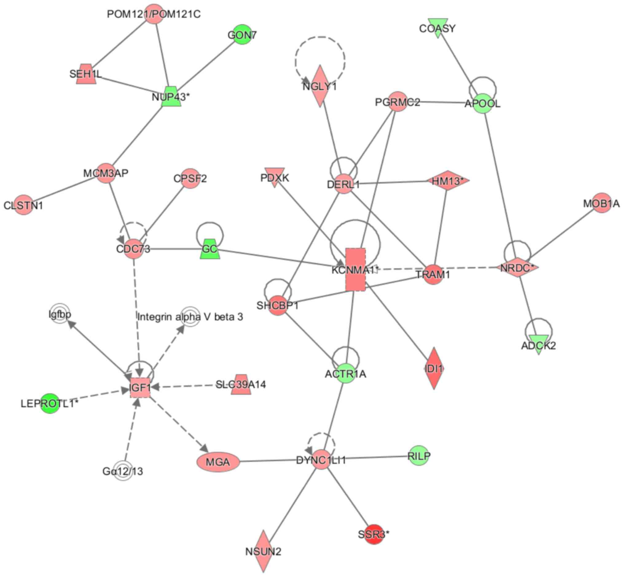 The IPA network generation algorithm was used to split the network map between molecules into multiple networks and to score each network. All networks were sorted by score value. Fig. 9 shows the genetic interaction network map: KCNMA1 (potassium calcium-activated channel subfamily M α 1), cell division cycle 73, nardilysin convertase, insulin-like growth factor 1 and dynein cytoplasmic 1 light intermediate chain 1 are the primary genetic interaction nodes. The interaction network primarily affects ‘cellular assembly and organization’, ‘cellular function and maintenance’ and ‘connective tissue disorders’.