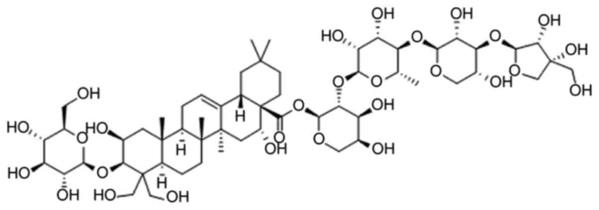 Gallbladder cancer (GBC) has the highest incidence among malignant tumors of the biliary tract system, ranking fifth among the common malignant diseases of the digestive system worldwide (1), with an age-standardized rate (ASR) of ~2.2 per 100,000 in 2012 (2). Due to the difficulty of early diagnosis, rapid invasion and metastasis are common, while treatment strategies are limited, resulting in patients with GBC having a poor prognosis (3,4). Therefore, the development of an effective agent that can prolong the survival of patients with GBC is urgently required. There is a long history of the use of plants to treat cancer. Studies have revealed a vast chemical diversity in numerous plants, which remain a notable source of antitumor drugs (5–8). Platycodin D (PD; Fig. 1) is a triterpenoid saponin extracted from Platycodonis (9). Previous studies have revealed that PD is a promising anticancer compound that can inhibit various cancer cell lines, including prostate cancer (10), glioma (11), leukemia (12), liver cancer (13), breast cancer (14) and gastric carcinoma (15), through various mechanisms including proliferation and metastasis inhibition (16,17), apoptosis induction (10), cell cycle arrest (12) and autophagy (18). However, the effect of PD on GBC cell lines remains unknown. Therefore, the present study aimed to explore the antitumor activity of PD on GBC cells and to determine its potential molecular mechanisms of action, with the goal of providing a promising drug for the future treatment of GBC.
