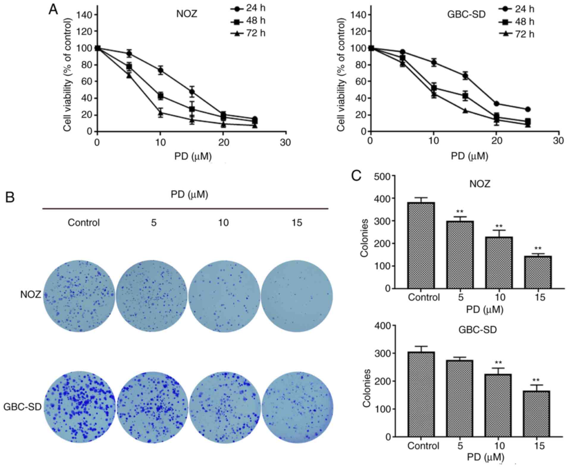 GBC cells were added into 96-well plates at a density of 2×103 cells/well and cultured overnight at 37°C and 5% CO2. Subsequently, different concentrations of PD (0, 5, 10, 15, 20 and 25 µmol/l) were added to each well, and the cells were cultured for 24, 48 or 72 h, separately. MTT (5 mg/ml) solution was added to the wells (10 µl/well) and incubated at 37°C for 4 h. The culture medium was then replaced with DMSO (100 µl/well) to dissolve the purple formazan and a microplate reader (BioTek Instruments, Inc.) was used to measure the absorbance at 490 nm.