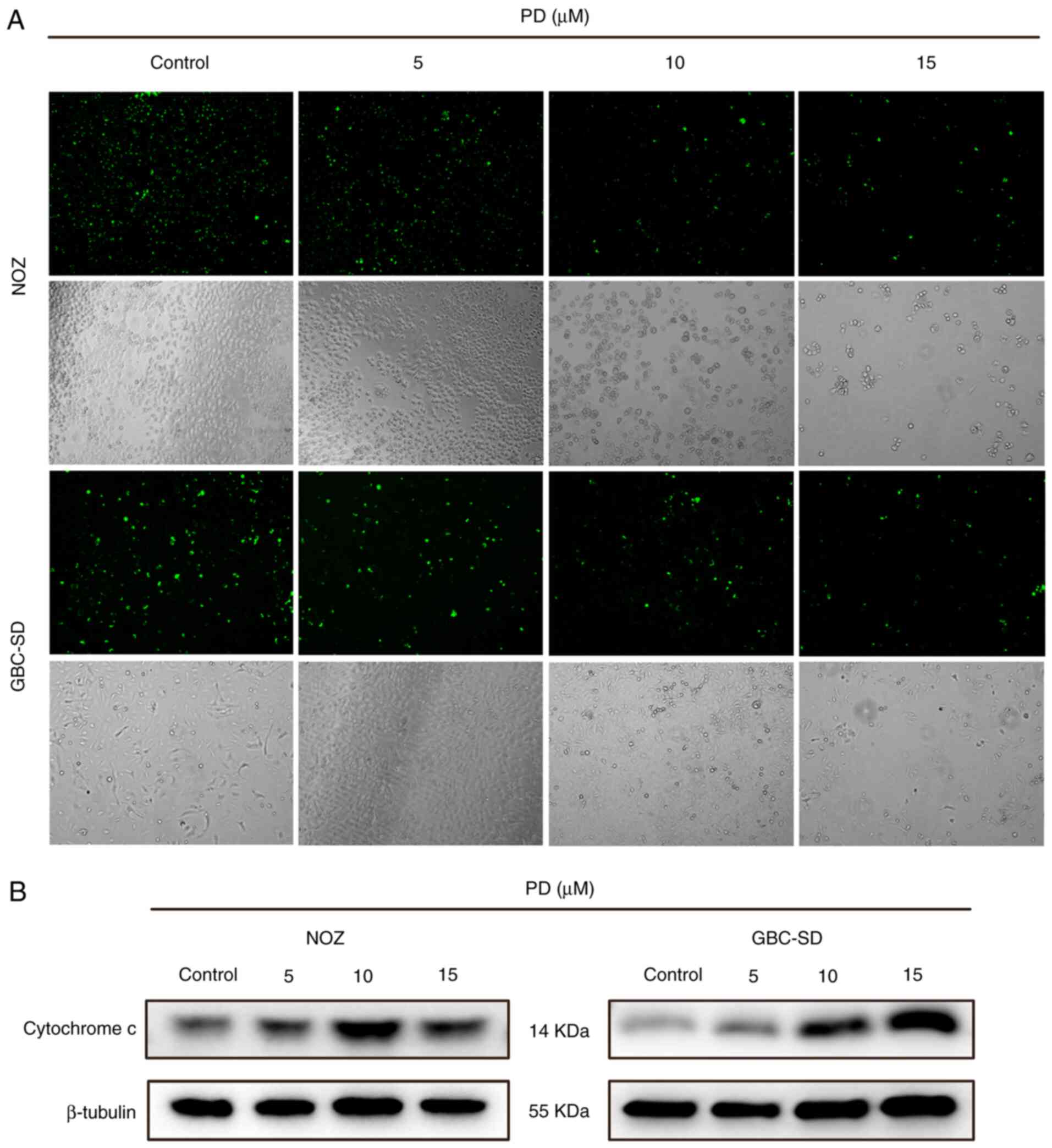 To assess the potential mechanisms of action behind PD-mediated growth inhibition, PD-treated GBC cells were analyzed using flow cytometry (Fig. 3A). As the drug concentration increased, the proportion of apoptotic cells also increased, while the percentage of surviving cells was reduced (Fig. 3B). Subsequently, the morphology of the nuclei was analyzed using Hoechst 33342 staining. In the control group, the morphology of the cells was normal and the chromatin was uniformly distributed, while the chromatin in the PD-treated group were markedly aggregated and broken (Fig. 3C). Subsequently, Mito-Tracker green was used to stain the mitochondria. After treatment, bright green fluorescence was observed in the control group, while the fluorescence intensity of the PD-treated group was visibly reduced (Fig. 4A). Additionally, cytochrome c expression was higher in the PD-treated groups than that in the control group (Fig. 4B).
