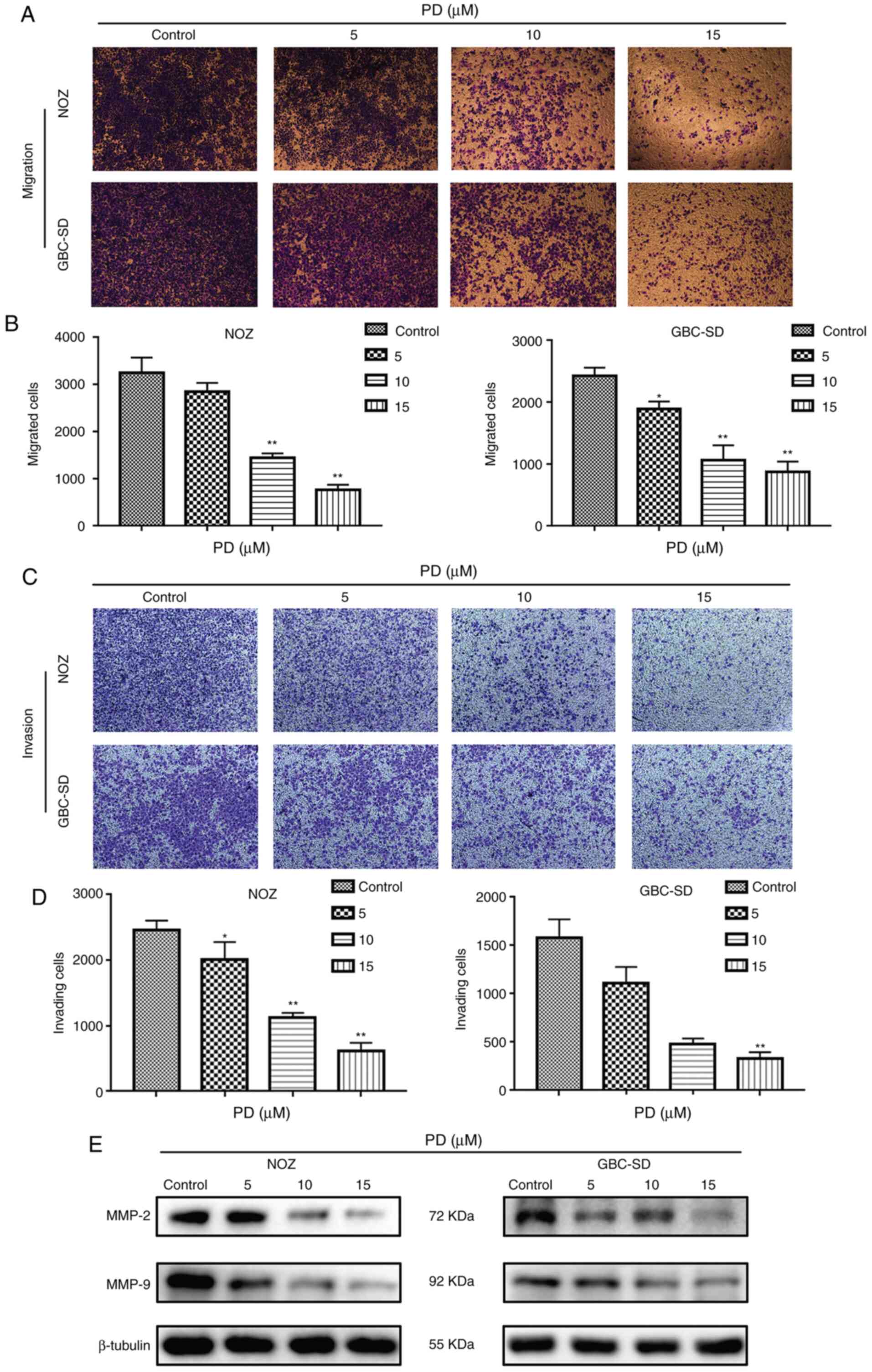To explore the influence of PD on the migratory and invasive abilities of GBC cells, cell migration and invasion assays were performed. Compared with the control group, PD treatment (10 and 15 µmol/l) markedly suppressed the migration numbers of NOZ and GBC-SD cells (Fig. 5A) and the difference was statistically significant (P<0.01; Fig. 5B). In addition, in the cell invasion assay, PD treatment led to a significant anti-invasion effect in GBC cells and this effect was dose-dependent (Fig. 5C and D). Additionally, western blotting analysis confirmed that MMP-2 and MMP-9 had low expression in PD-treated GBC cells compared with the control group (Fig. 5E). These data indicated that PD inhibited the migration and invasion of GBC cells.