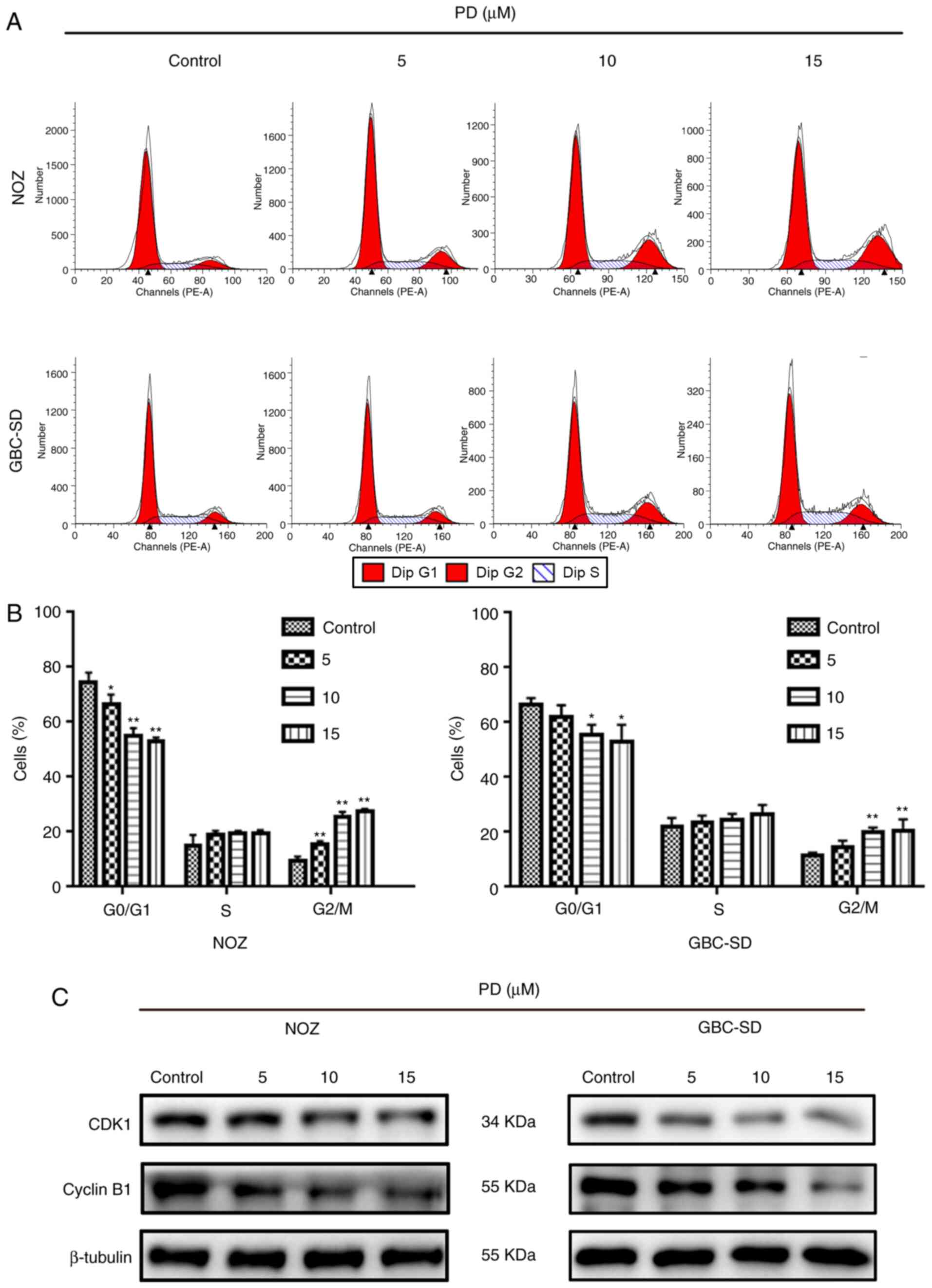 For cell cycle analysis, the Cell Cycle and Apoptosis Analysis kit was used (Beyotime Institute of Biotechnology). NOZ and GBC-SD cells were seeded into 6-well plates and incubated overnight at 37°C and 5% CO2. The supernatant was replaced with different concentrations (0, 5, 10 and 15 µmol/l) of PD. After 48 h of incubation at 37°C and 5% CO2, the cell layer was digested using trypsin, washed with cold PBS and fixed with 70% ethanol at 4°C for at least 2 h before storing at 4°C overnight. Subsequently, the cells were washed with cold PBS and resuspended in staining buffer. Next, 0.1 mg/ml RNase A and 0.1 mg/ml PI were added to the cell suspension. The staining buffer, RNase A and PI were part of the Cell Cycle and Apoptosis Analysis kit (Beyotime Institute of Biotechnology) and were used according to the manufacturer's instructions. The cells were analyzed using flow cytometry after incubation at 37°C in the dark for 30 min. BD FACSDiva Software v6.1.3 (BD Biosciences) was used to analyze the distribution of the cell cycle phases.