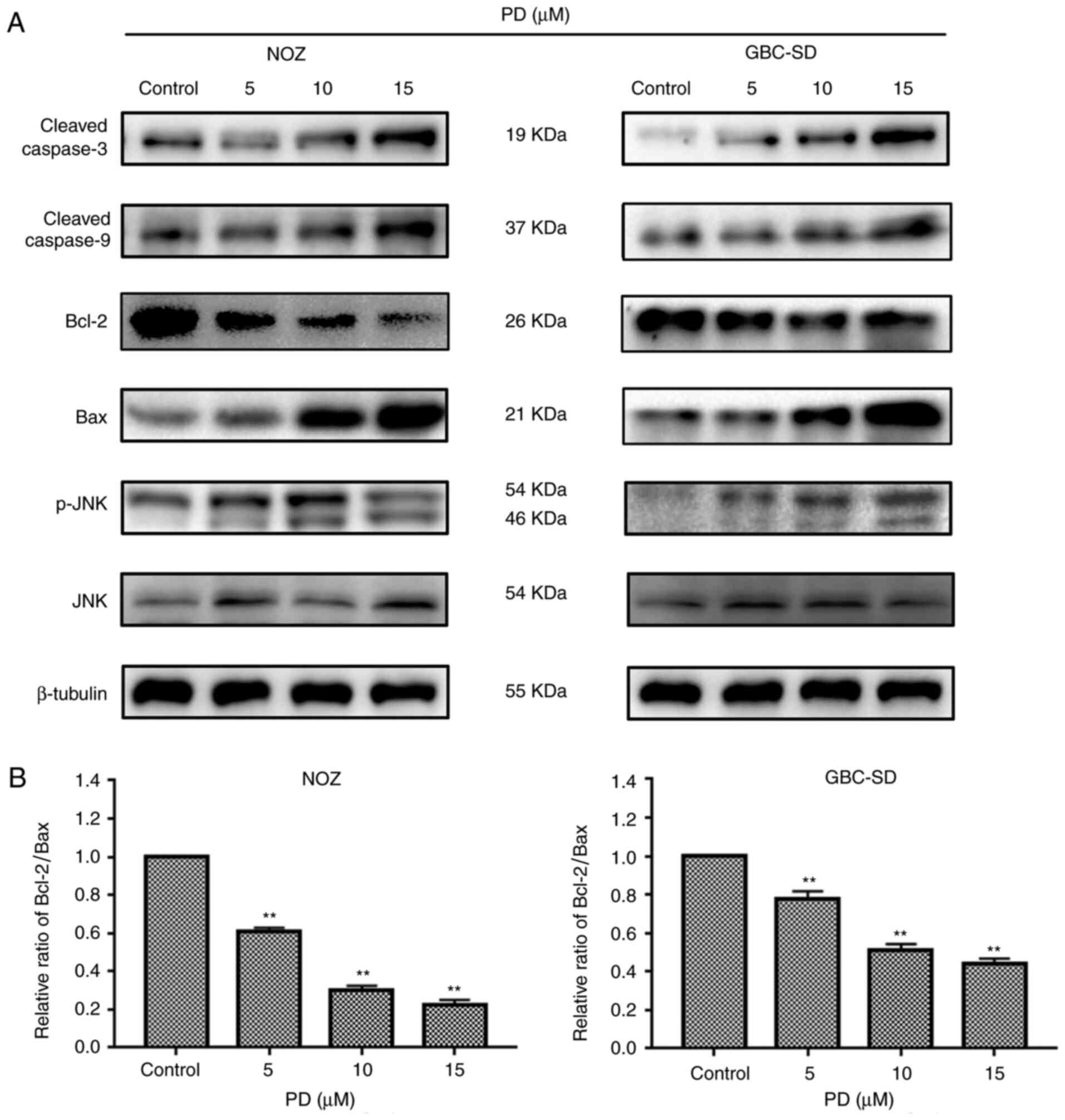 Caspase family and Bcl-2 family proteins are both important in the regulation of apoptosis (19). To further elucidate how PD induced apoptosis in GBC cells, the expression levels of apoptosis-associated proteins were investigated. It was observed that the expression levels of Bax, cytochrome c, cleaved caspase-9 and cleaved caspase-3 were increased with an increased concentration of PD, while Bcl-2 expression was decreased with an increased concentration of PD compared with the control group (Figs. 4B and 7A). According to a previous study, the Bax/Bcl-2 ratio is a key factor in the regulation of the apoptotic process (20). In the present study, PD decreased the expression levels of the anti-apoptotic protein Bcl-2 and increased those of the pro-apoptotic protein Bax, thereby decreasing the ratio of Bcl-2/Bax (Fig. 7B). Additionally, it was observed that p-JNK expression was upregulated, while JNK expression was not markedly changed. In summary, the present results suggested that PD may induce apoptosis by initiating mitochondrial destruction through the JNK signaling pathway in GBC cells.