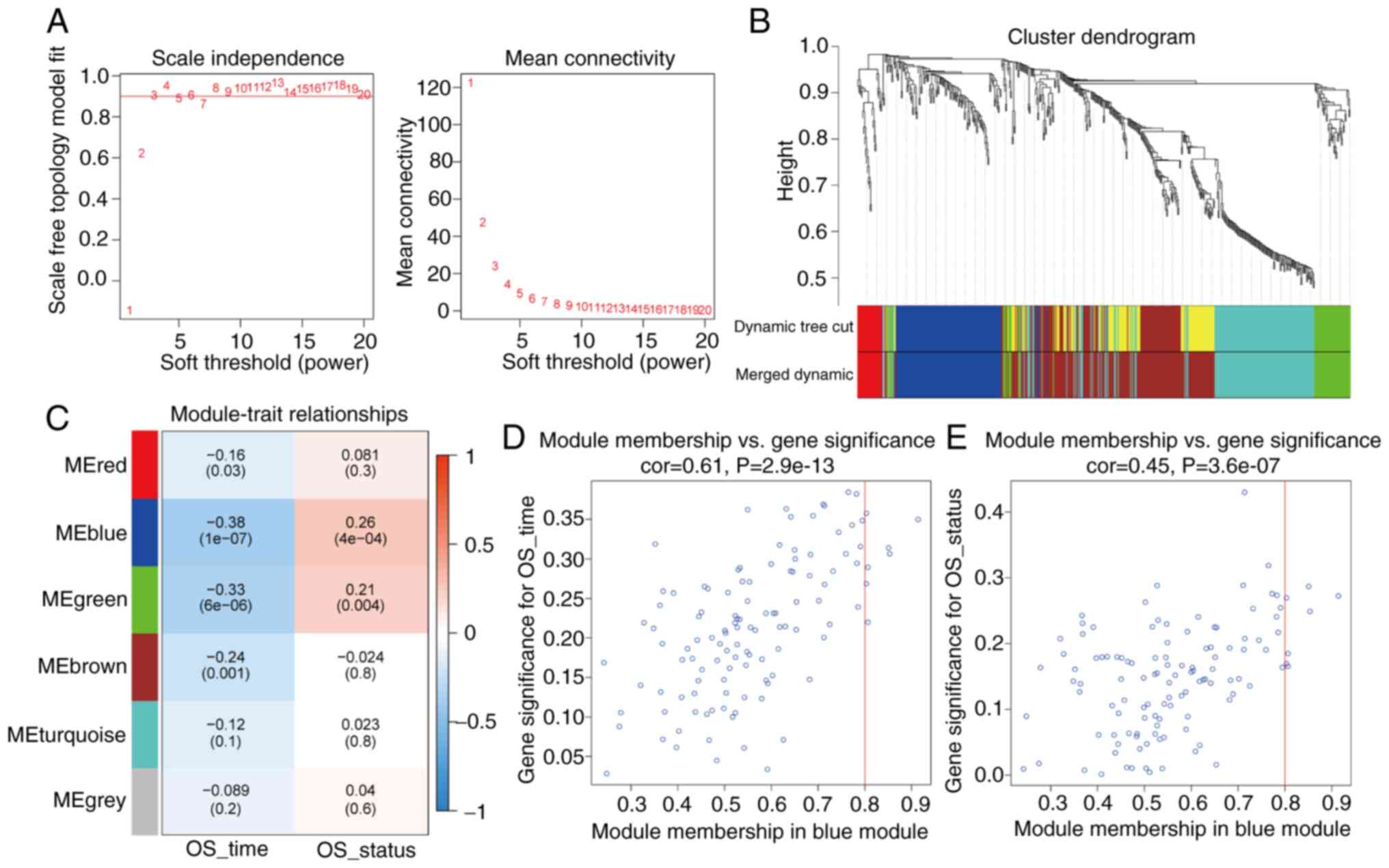 A total of 554 IRGs were identified to be differentially expressed between normal pancreatic tissues and pancreatic tumors (Fig. S1A and B). In the WGCNA of TCGA cohort, two important parameters, R2 (R2>0.9) and average connectivity were fully considered, hence β=4 was selected as the soft-thresholding power (Fig. 1A). According to the weighted adjacency matrix constructed by the soft-thresholding power, the differential immune genes in the cohort from TCGA were classified into six diverse gene modules (Fig. 1B). The present study assessed the association between the module genes and characteristics including the survival time and status of patients with pancreatic cancer in the cohort from TCGA. Based on the correlation coefficient and the P-value, it was revealed that the blue module had the highest module significance (OS_time: cor=−0.38, P=1×10−7; OS_status: cor=0.26, P=4×10−4; Fig. 1C) and gene significance (OS_time: cor=0.61, P=2.9e-13; OS_status: cor=0.45, P=3.6e-7; Fig. 1D and E). Therefore, the blue module, which contained 117 IRGs, was selected for further analysis.