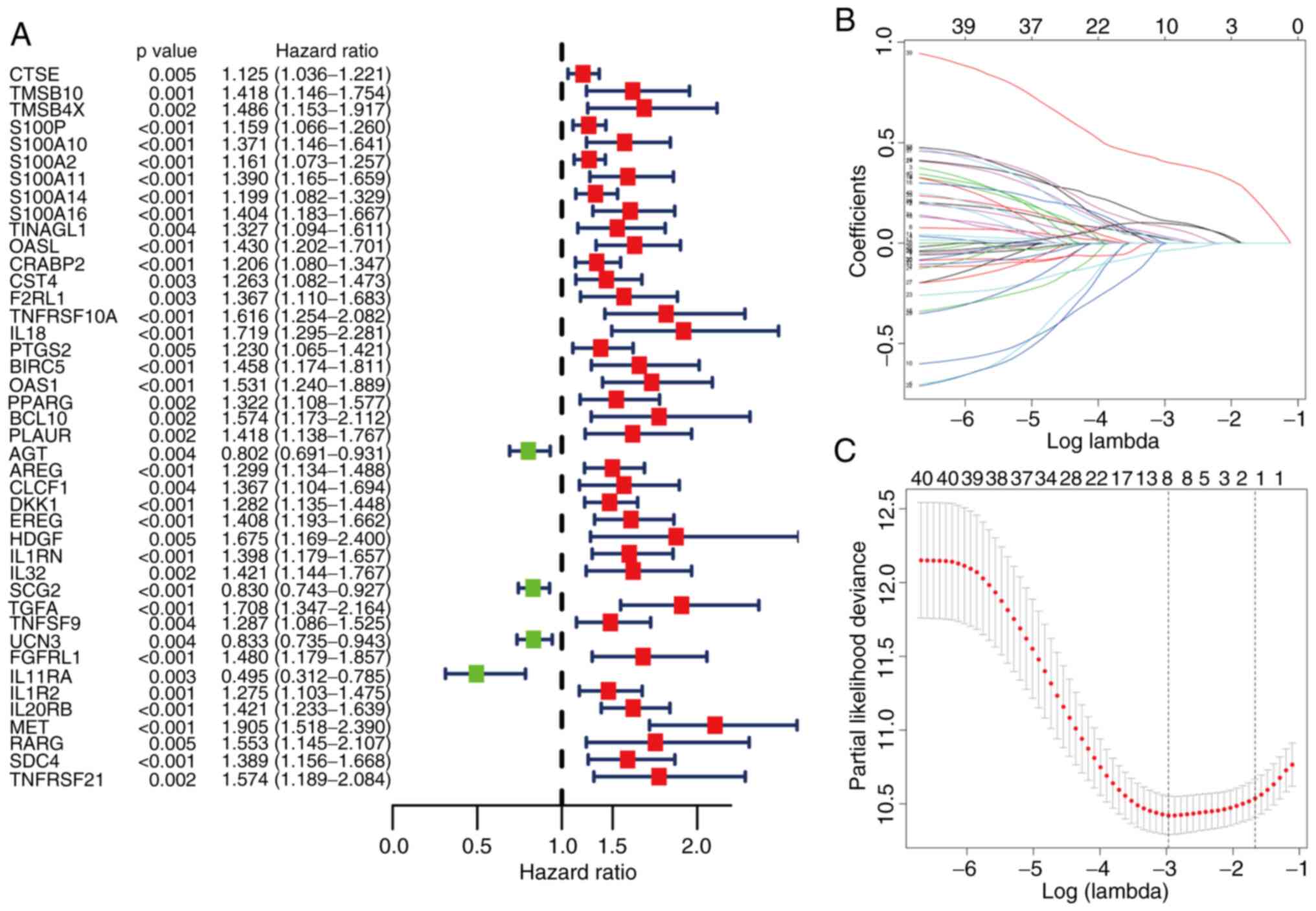 In order to screen IRGs with the most predictive efficacy in univariate Cox regression analysis (survival package, version 2.41–3; http://cran.r-project.org/web/packages/survival/index.html), a least absolute shrinkage and selection operator (LASSO) analysis (glmnet package, version 3.0–1; http://cran.r-project.org/web/packages/glmnet/index.html) was adopted to deal with over-fitting of the model. Subsequently, a prognostic model was constructed using the IRGs obtained from the multivariate regression analysis. The risk score (RS) of each patient was calculated by multiplying the expression level of each IRG with its corresponding regression coefficients. The following computational algorithm was used for this analysis (25–27): RS=βgene(1) × exprgene(1) + βgene(2) × exprgene(2) + … + βgene(n) × exprgene(n). ‘β’ is the regression coefficient generated from univariate Cox analysis of IRGs, and ‘exprgene’ refers to the expression of IRGs in the sample. The optimal cut-off point of risk value that was most relevant to survival was determined using the surv_cutpoint function in the survminer package (version 0.4.3; http://www.sthda.com/english/wiki/survminer-r-package-survival-data-analysis-and-visualization), which was the standard to separate PDAC samples into high-and low-RS subgroups.