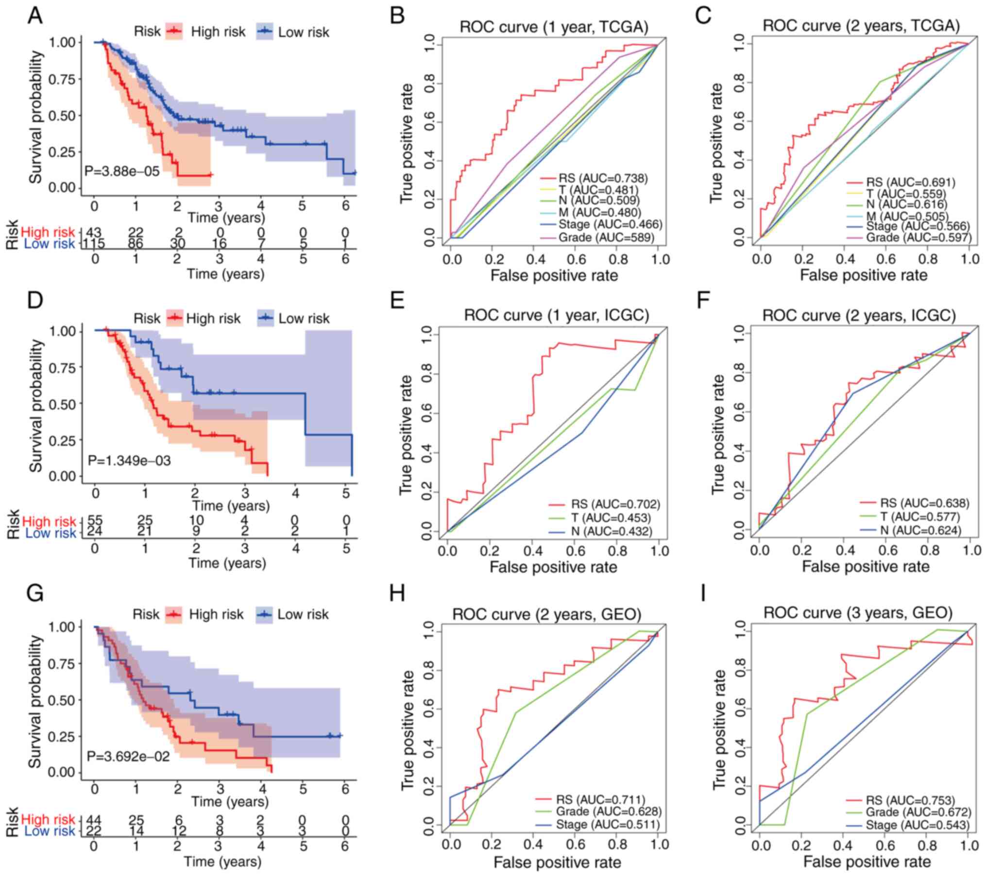 In order to confirm the robustness of the prognostic classifier used in the present study, the duplicate formula for RS and cut-off value were used for the analysis of the ICGC and GEO validation sets. In each cohort, the 79 patients in the ICGC cohort and 66 patients in the GSE62452 dataset were divided into high- and low-RS groups, respectively. The KM survival curves (P=0.03692; Fig. 3D and G) and ROC curves (Fig. 3E, F, H and I) validated the reliability of the prognostic model used in the present study. Among them, although RS was not effective in predicting the 1-year survival rate (P>0.05; data not shown) of patients with pancreatic cancer in the GSE62452 dataset, it exerted a preferable effect on calculating the 3-year survival rate (Fig. 3G and I). Furthermore, to emphasize the superiority of the RS in predicting overall survival of patients with PDAC, time-dependent ROC curve analysis was used to compare the predictive effect of RS with classic disease classification parameters, and this revealed that RS was the best index in three independent databases (Fig. 3). The RS distribution, survival status and risk gene expression in the training cohort and validation cohort are presented in Fig. S2A-I.