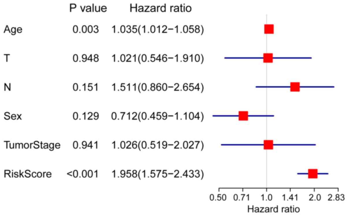 Based on univariate Cox regression analysis of TCGA cohort, 42 genes with significant prognostic value were further extracted from the blue module (P<0.01; Fig. 2A). LASSO regression analysis was applied to avoid over-simulation of the model by adjusting the complexity of the classifier, and IRGs that correlated highly with one another were deleted (Fig. 2B and C). In the case of dimensionality reduction of the preliminary results using the LASSO method, the genes and their coefficients involved in the model were determined by multivariate Cox regression analysis. The coefficients of four IRGs are presented in Table SIV. Ultimately, four optimal IRGs [2′-5′-oligoadenylate synthetase 1 (OAS1), MET proto-oncogene, receptor tyrosine kinase (MET), interleukin 1 receptor type 2 (IL1R2) and interleukin 20 receptor subunit β (IL20RB)] were included in the prognostic model to calculate the RS, and the formula was as follows: RS=0.221350 × OAS1 + 0.515099 × MET + 0.179351 × IL1R2 + 0.141478 × IL20RB. The cut-off value was determined to be 4.15 using the surv_cutpoint function in the survminer R package, and the patients were divided into high- and low-RS groups. In the TCGA training set, the KM survival curve analysis demonstrated that the low-RS group had significantly improved survival compared with the high-RS group (P=3.88e-05; Fig. 3A), and the ROC curve revealed that the model had a good predictive function for the prognosis of patients with pancreatic cancer (ROC 1-year=0.738; Fig. 3B; ROC 2-years =0.691; Fig. 3C). Additionally, it was revealed that the RS could be used as an independent predictor [hazard ratio (HR), 1.958; P<0.001; Fig. 4] for the prognosis of patients with pancreatic cancer in the training cohort by multivariate regression analysis including RS, sex, age, TNM stage and tumor stage.