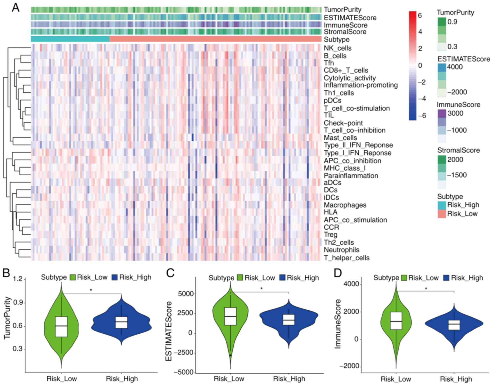 The analysis results of the ESTIMATE algorithm revealed the difference of immune status between high- and low-RS groups in the cohort from TCGA (Fig. 5A-D). ssGSEA analysis revealed that the high-RS group had lower enrichment levels in multiple positively regulated immunity gene sets (‘Cytolytic activity’ and ‘Inflammation-promoting’) than the low-RS group (Fig. 5A), which suggested that various immunity-associated biological processes and mechanisms were activated in both the aforementioned two groups, and increased immune activity may help patients with pancreatic cancer achieve improved outcomes. Notably, the high-RS group had a higher level of tumor purity and lower immune score than the low-RS group (P<0.05; Fig. 5B and D). The high-RS group also had a lower ESTIMATE score which reflected the comprehensive level of tumor purity, immune score and stromal score (P<0.05; Fig. 5C).