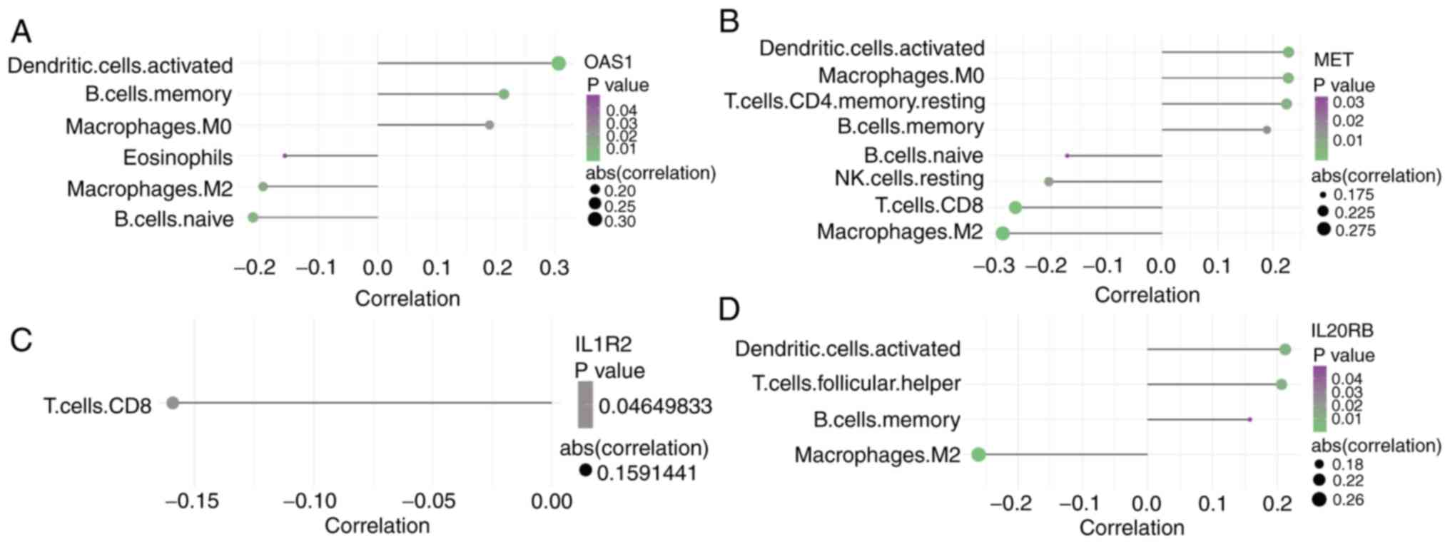 The CIBERSORT algorithm was used to evaluate the composition of 22 immune cell types in TCGA cohort. It was revealed that the resting CD4 memory cells occupied the highest proportion among all cells, while activated CD4 memory cells accounted for a small proportion (Fig. 6A). This suggested that the absence of immune cell components with immune activation functions in the immune microenvironment may serve an important role in accelerating the development of pancreatic cancer. By comparing the composition of immune cells in the high-RS group and the low-RS group of TCGA cohort, it was revealed that the high-RS group had a lower infiltration of CD8 T cells and a higher composition of M0 macrophages (Fig. 6B). Finally, the present study analyzed the correlation between the gene expression of four marker genes in the TCGA cohort and the composition of 22 immune cells. The results revealed that the expression levels of OAS1, MET and IL20RB genes were negatively correlated with the composition of M2macrophages (Fig. 7A, B and D; P<0.01). With the increase of CD8 T cells, the gene expression levels of MET and IL1R2 were decreased (Fig. 7B and C; P<0.01), which suggested that CD8 T cells may repress the activation of the oncogenes observed in pancreatic cancer.