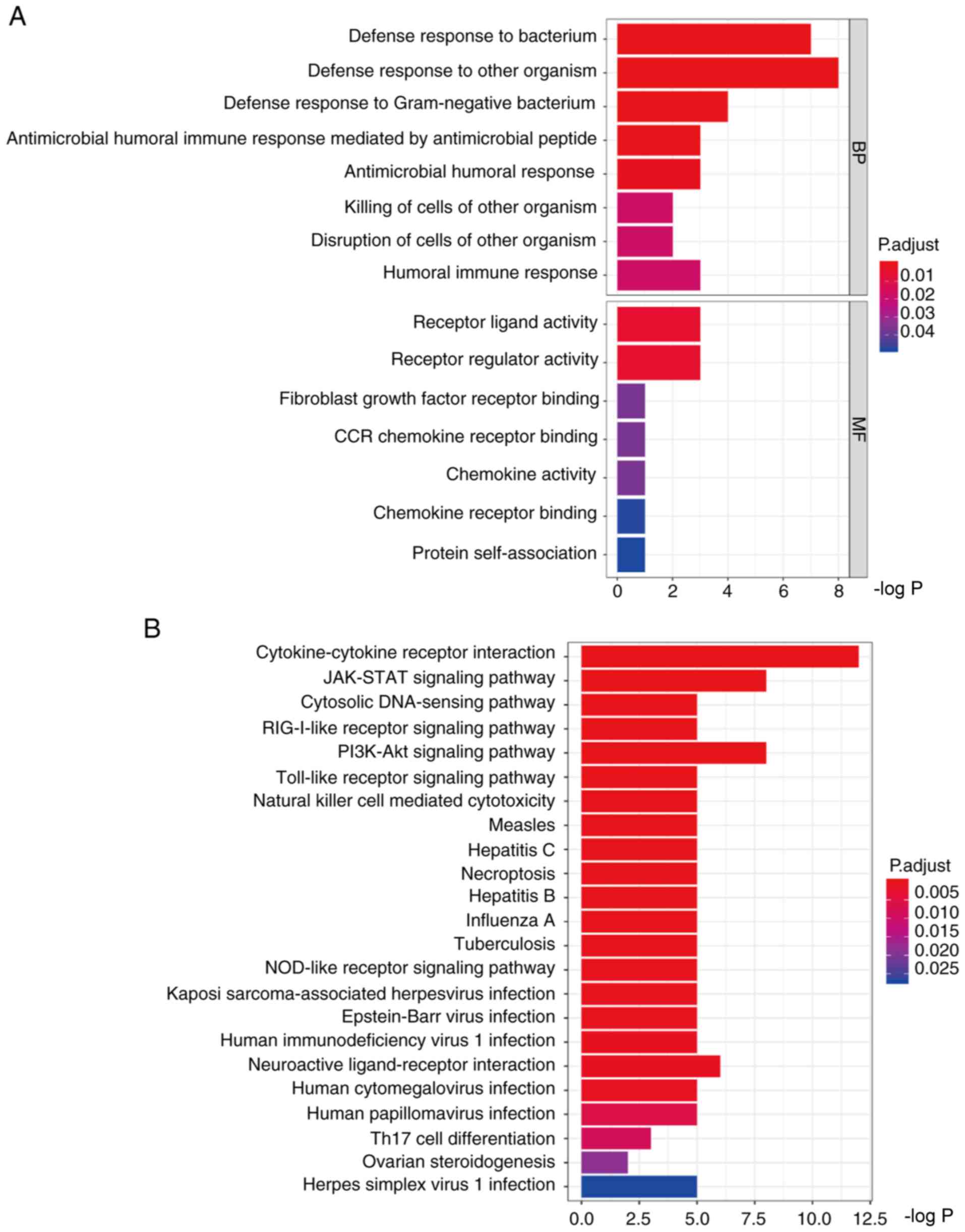The results revealed that the upregulated genes were associated with 8 biological processes and 7 molecular functions, including ‘defense response to bacterium’, ‘defense response to other organisms’ and ‘receptor ligand activity’(Fig. 8A). Through pathway analyses, the present study revealed that upregulated genes were associated with ‘cytokine-cytokine receptor interaction’ and ‘JAK-STAT signaling pathway’ (Fig. 8B).