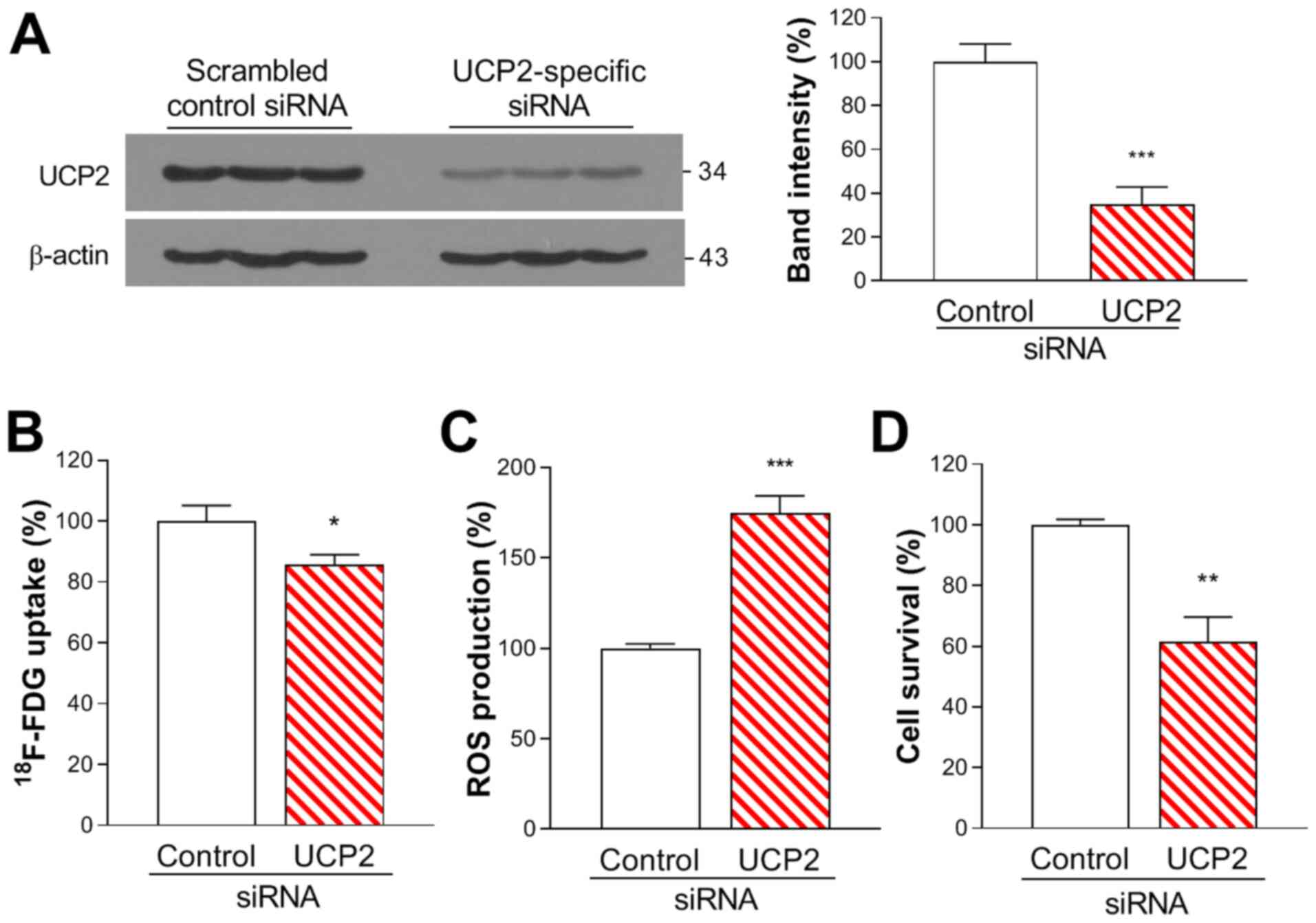 Silencing of UCP2 expression with siRNA slightly suppressed FDG uptake to 88.5±3.3% of that in control cells (Fig. 1B. ROS production was significantly enhanced by UCP2 knockdown to 174.7±9.6% of that in controls (Fig. 1C). SRB assays results revealed that UCP2 silencing significantly decreased A549 cell viability to 60.8±7.9% of that in the control group (Fig. 1D).
