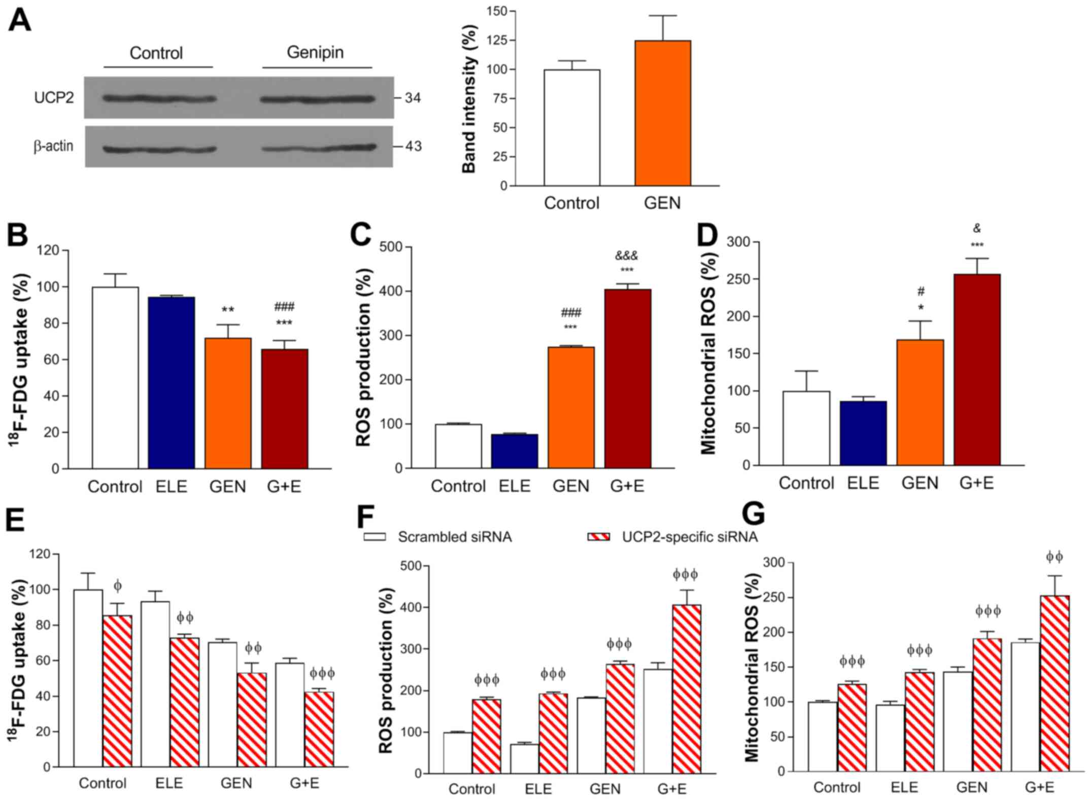 The present study first confirmed that A549 cancer cells exhibited a high level of UCP2 protein expression. In these cells, UCP2 knockdown with a specific siRNA mildly decreased FDG uptake, significantly elevated ROS production and suppressed cell survival compared with those in the control group. When the biological effects of elesclomol and genipin were compared, it was observed that elesclomol monotherapy was unable to significantly affect FDG uptake or ROS production. By contrast, genipin mildly decreased FDG uptake and significantly elevated cellular and mitochondrial ROS production in a manner similar to that obtained by UCP2 knockdown. Furthermore, the effects were substantially enhanced in cells treated with a combination of elesclomol and genipin. In these experiments, elesclomol and genipin were used at the concentrations of 0.1 and 250 µM, respectively, which were slightly lower compared with the 0.5 µM (4) and 400 µM (27) used in previous studies, respectively, to determine their anticancer effects.