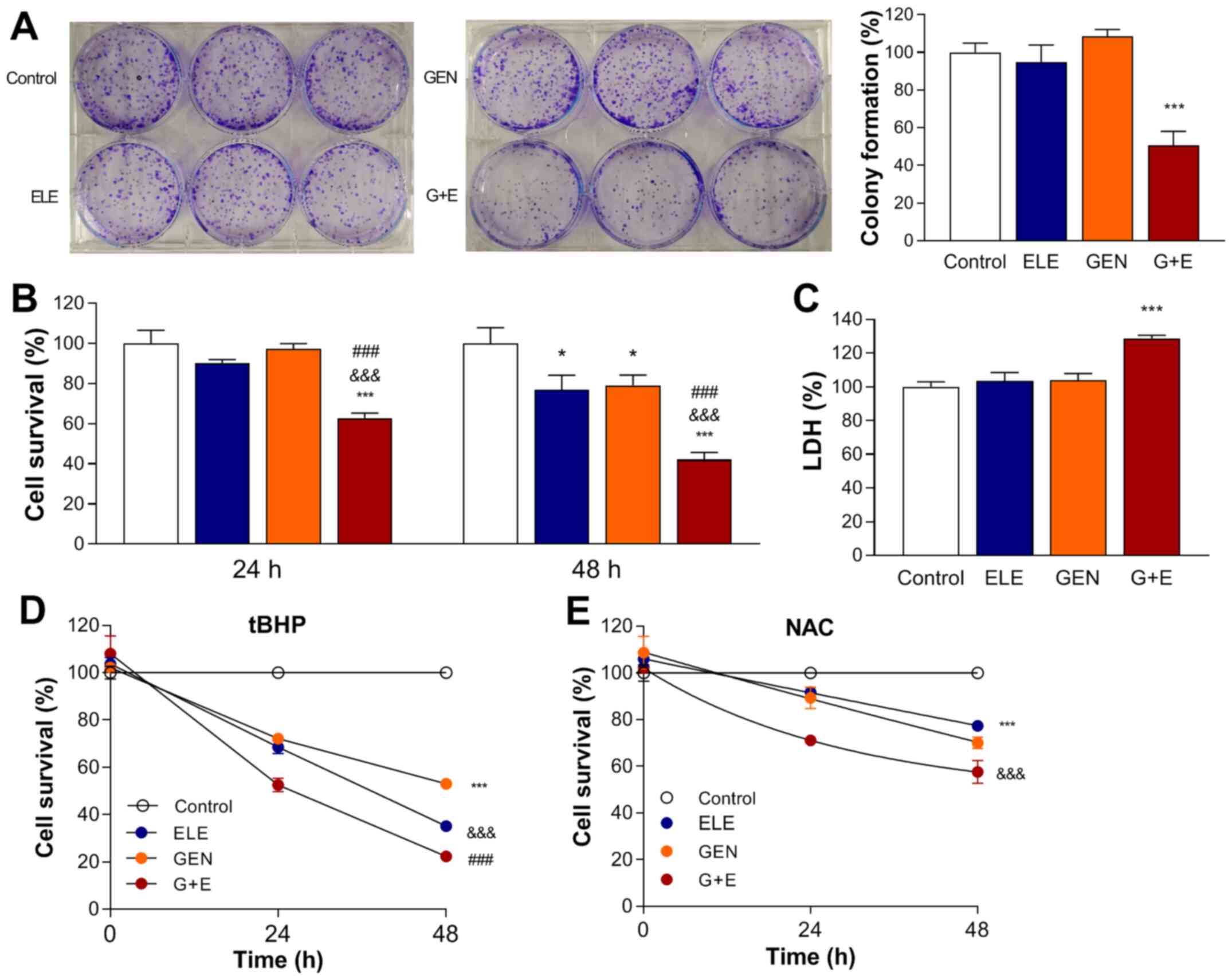 The role of ROS on the cytotoxic effects of the two drugs was assessed in the presence of the exogenous ROS inducer TBHP and ROS scavenger NAC. The results demonstrated that the cytotoxic effects of genipin, elesclomol and their combination were enhanced by TBHP and reduced by NAC; the cell survival in the elesclomol and genipin co-treated cells at 48 h was decreased to 22.3±1.9% of that in the control group by TBHP (Fig. 3D) and was partially recovered to 57.5±4.8% of that in the control group by NAC (Fig. 3E).