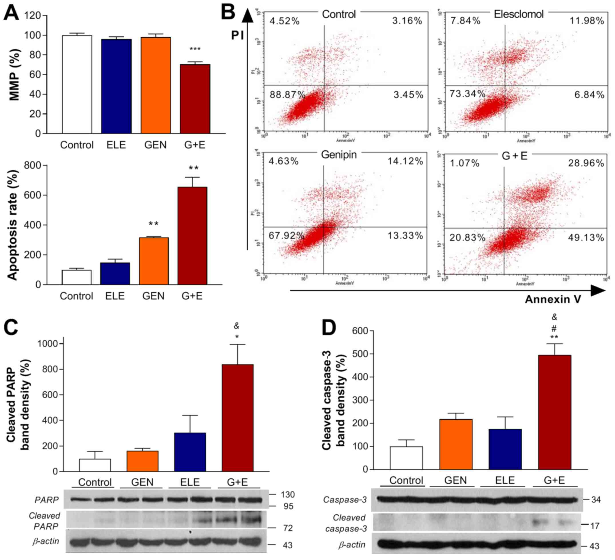 The present study next evaluated whether the antitumor effect of combining elesclomol with genipin involved the induction of apoptosis. The results of the MitoTracker Red assay demonstrated that co-treatment with elesclomol and genipin for 24 h significantly reduced A549 cell MMP to 70.4±2.5% of that in the control group (Fig. 4A). This was accompanied by a 6-fold increase in the percentage of Annexin V-positive apoptotic cells (Fig. 4B). In addition, the co-treatment induced a marked increase in the levels of cleaved PARP to 837.6±221.9% and of cleaved caspase-3 to 495.9±68.6% of those in untreated controls (Fig. 4C and D).
