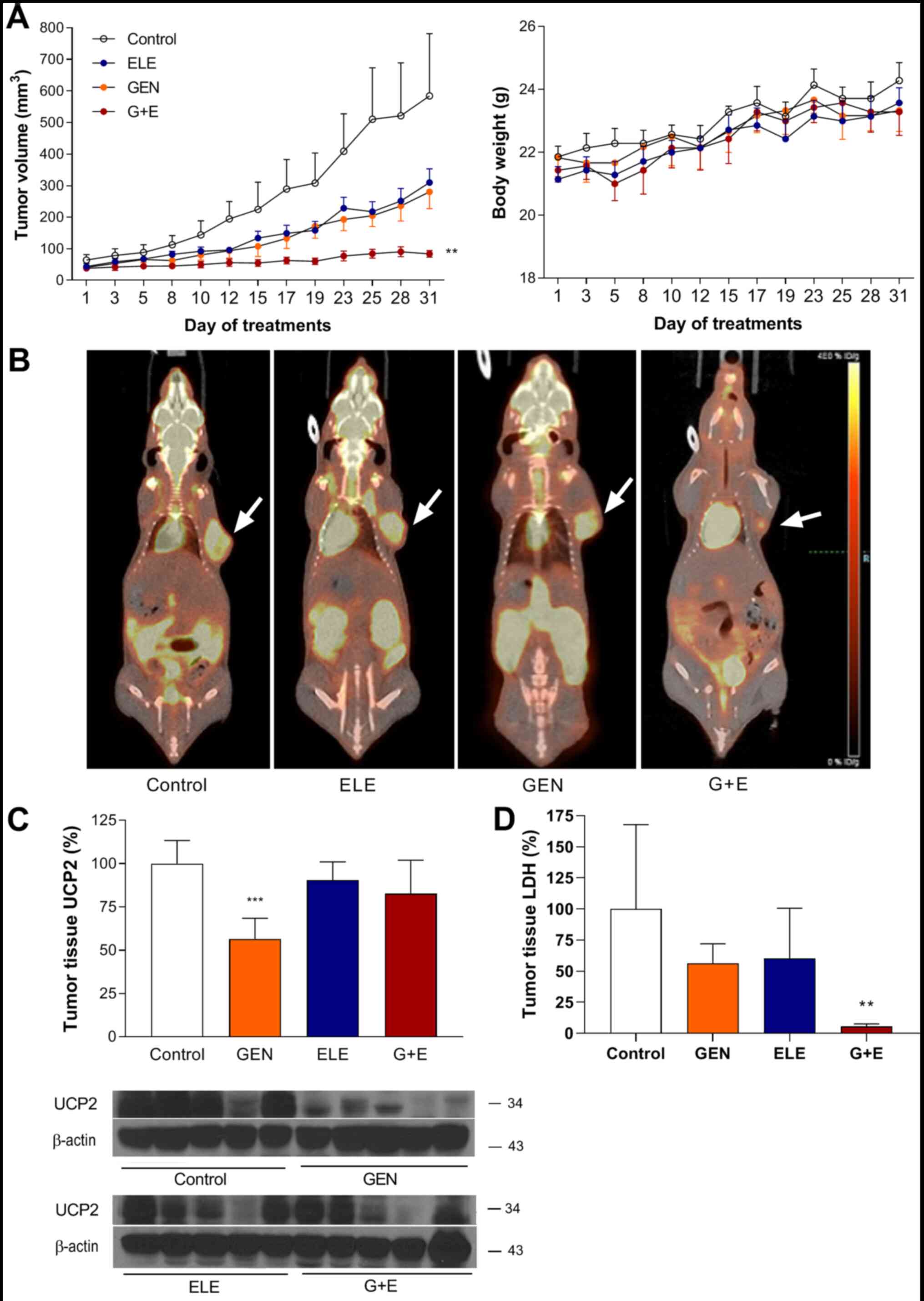 Further analysis of the xenograft tumor tissues revealed that the protein levels of UCP2 in tumors isolated from the genipin-treated mice were reduced compared with the control group. This result may indicate the preferential killing of tumor cells with greater UCP2 expression by genipin, which led to the remaining tumor tissue containing cells with lower UCP2 levels. Tumor tissue LDH level was reduced in mice treated with genipin plus elesclomol compared with the control group. This finding may indicate that fewer dying cancer cells exist in the reduced tumor tissues after long-term treatment with genipin and elesclomol.