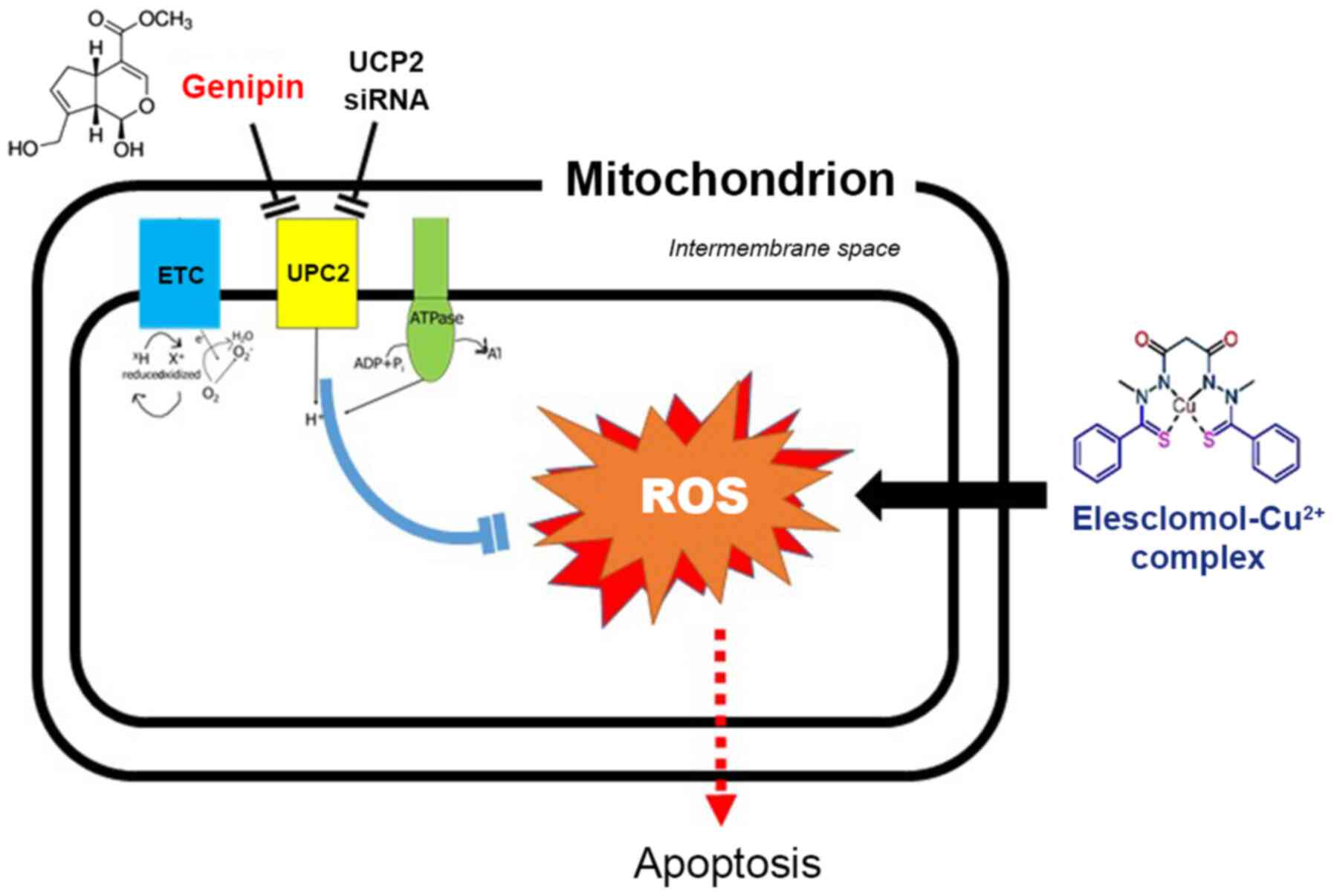 We hypothesized that UCP2 may protect cancer cells from elesclomol cytotoxicity, and that blocking UCP2 function with genipin may enhance the antitumor efficacy of elesclomol. The aim of the present study was to investigate the combined therapeutic effect of genipin and elesclomol, indicating the potential of a cancer inhibition strategy using co-treatment with the UCP2 inhibitor genipin in A549 lung cancer cells, where there are currently limited effects on ROS induction due to the high expression levels of UCP2.
